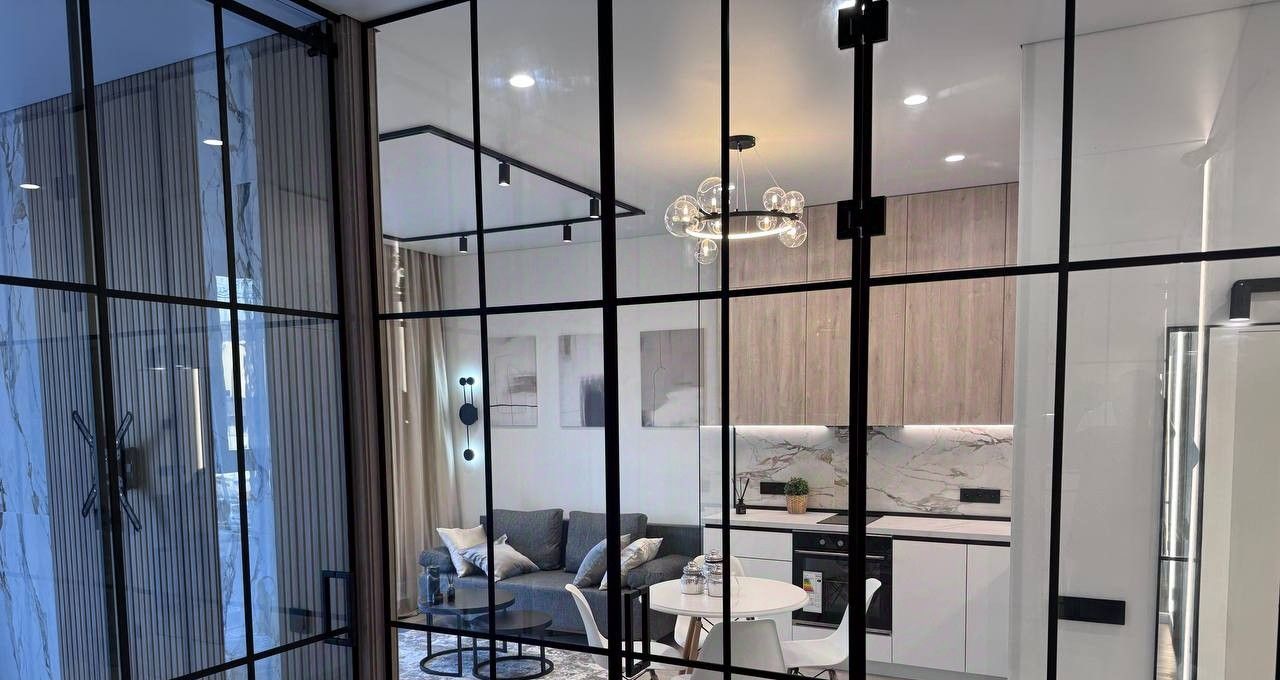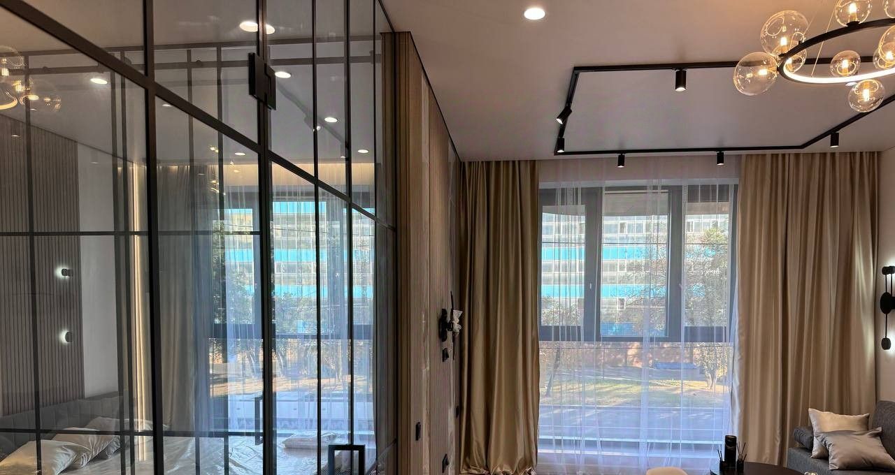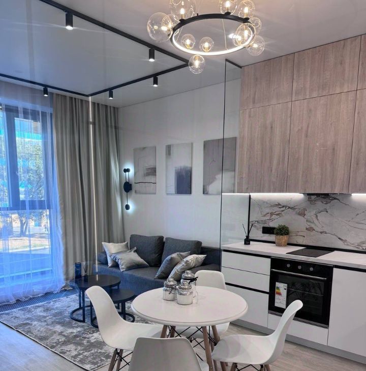 Апартаменты с дизайнерским ремонтом и техникой, полностью готовые к комфортному проживанию. В распоряжении: кухня-гостиная, кабинет, спальня, гардеробная. Очень хорошие окна, тишина полная в квартире.
