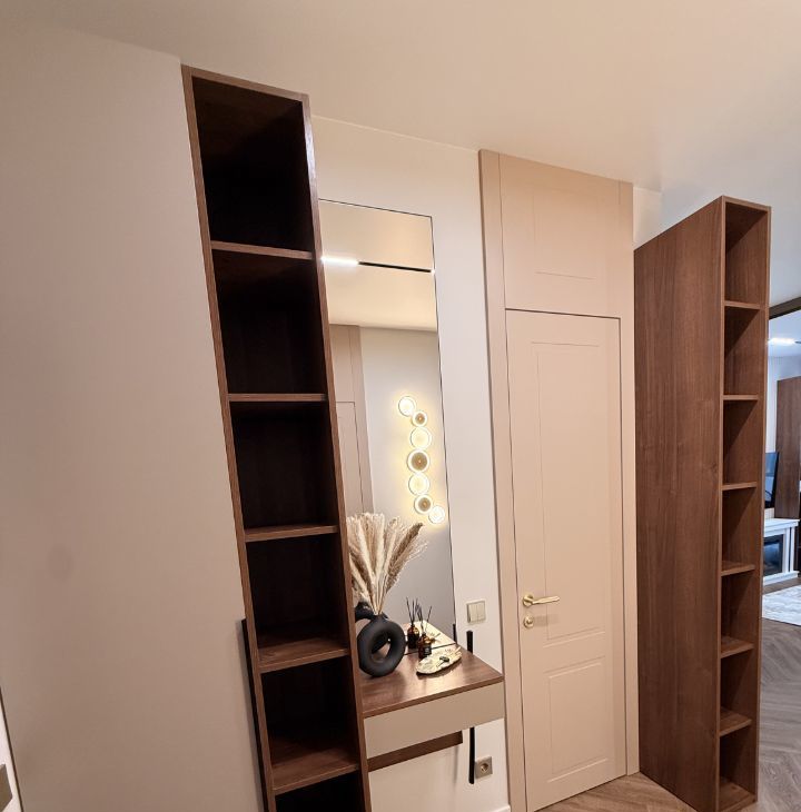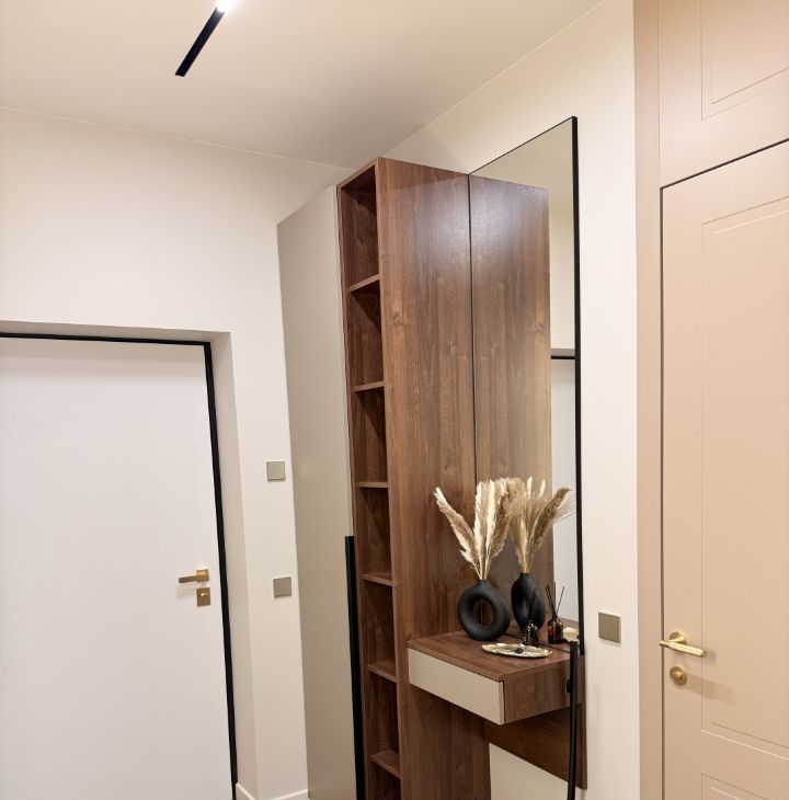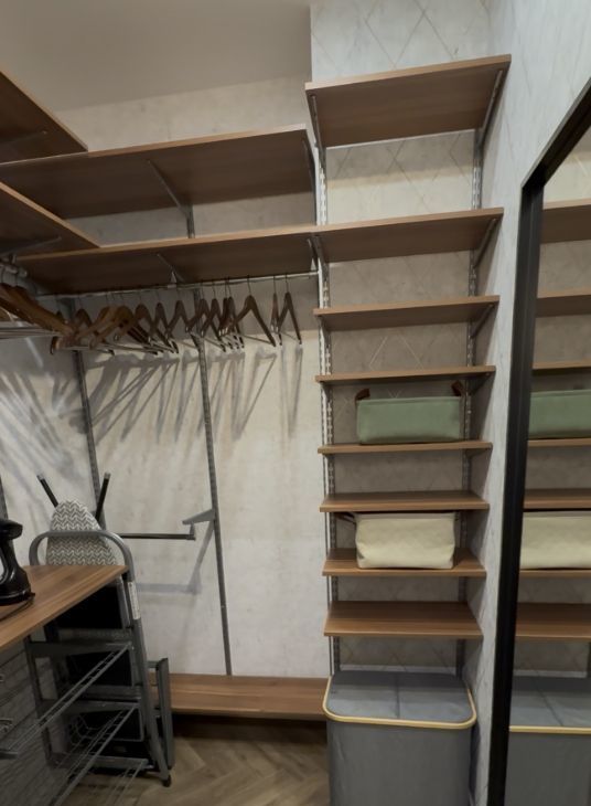 • Отдельная гардеробная комната с возможностью изменения высоты и расположения полок под вас. оснащена всем необходимым ( гладильная доска, сушилка, стремянка)