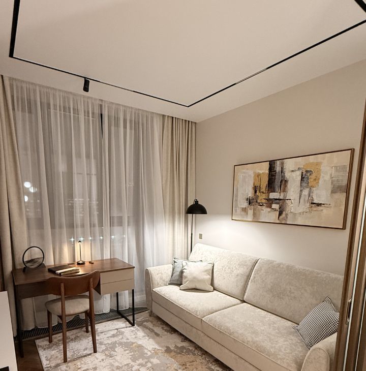 • Отдельно выделена зона кухни, столовой. Гостиная с кабинетом полностью изолируется путем закрывания перегородки. Отдельная уютная спальня.
