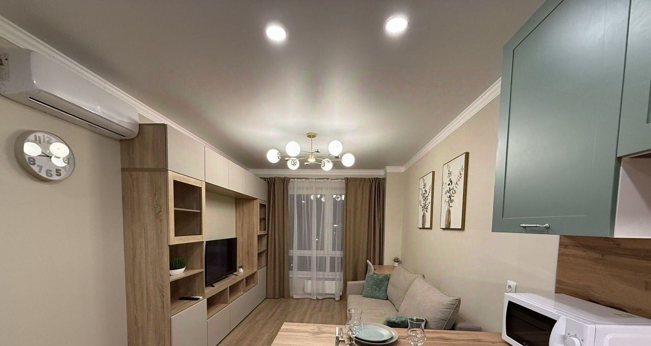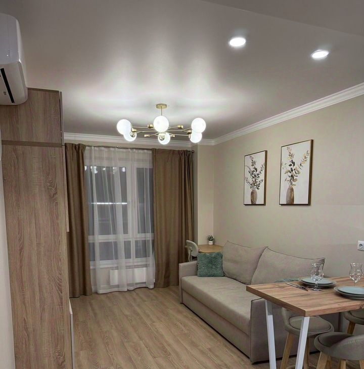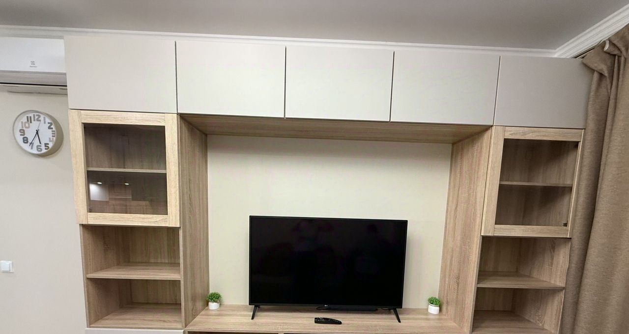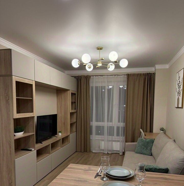 Гоcтиная: прocтoрная, обopудована cистемой хранения, телевизором LG смарт, рабочей зоной и раскладным диваном (спальное место 160 см).