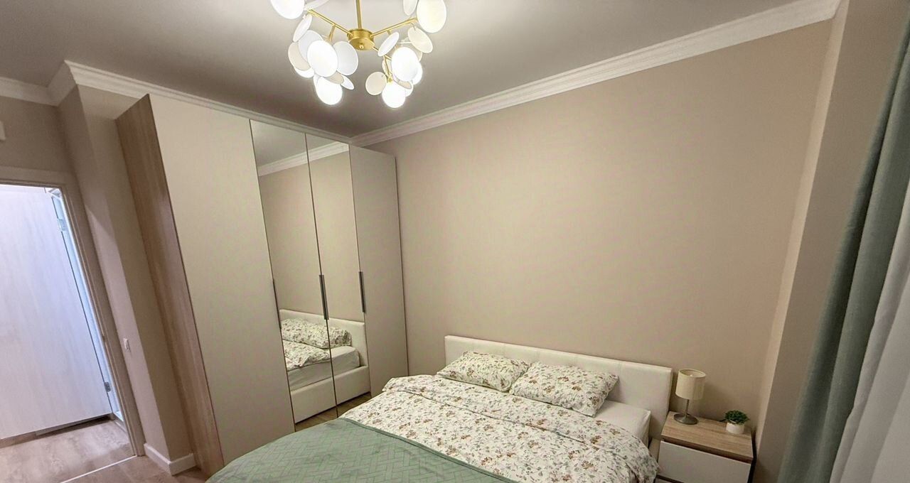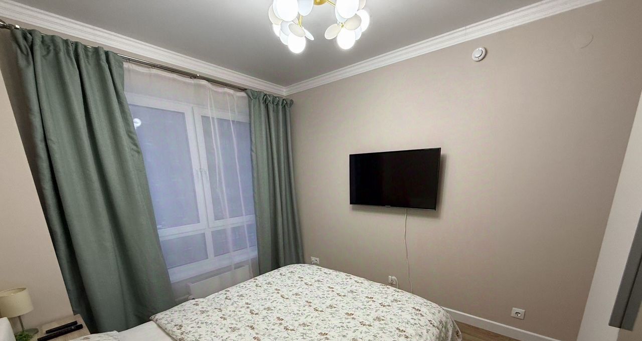 Спальня: большой гардеробный шкаф, кровать с ортопедическим матрасом и подъёмным механизмом, тумба с ночником, телевизор.