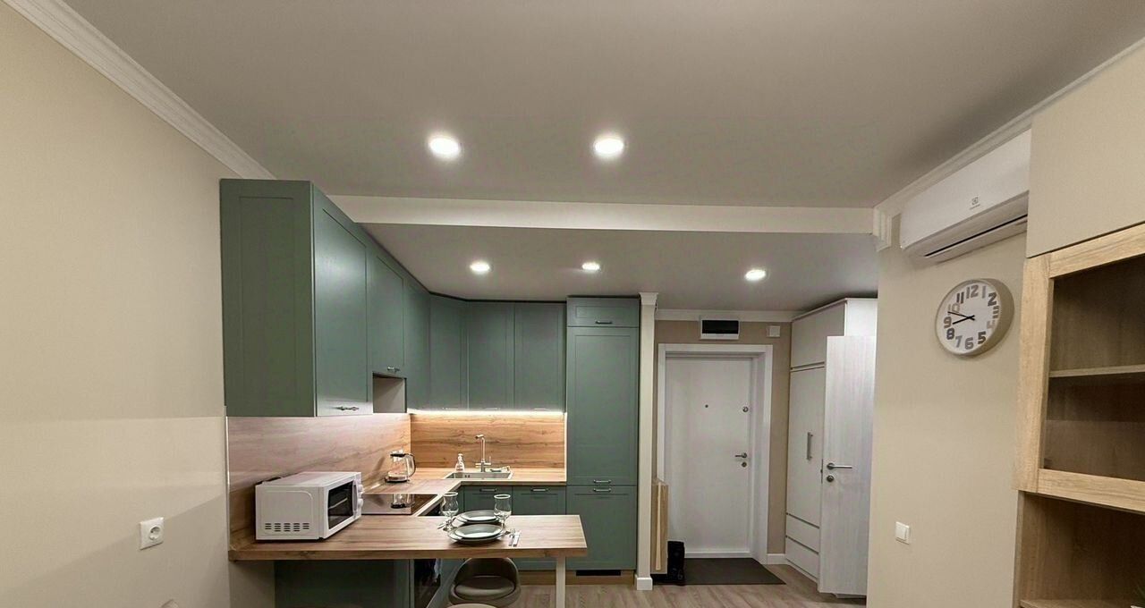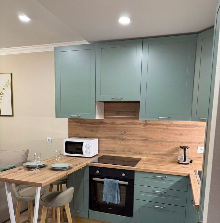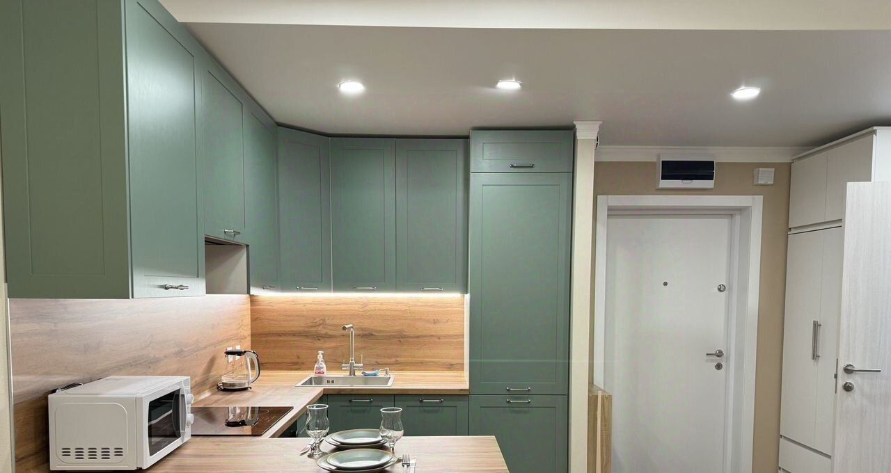 Кухня: гарнитур со встроенной техникой индукционная плита, духовой шкаф, микроволновка, холодильник, посудомоечная машина, фильтр для питьевой воды, подсветка рабочей зоны.