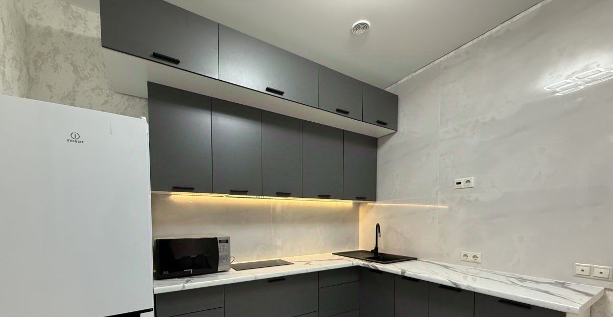 В прихожей большой шкаф. В кухонной зоне установлена бытовая техника. Укомплектована индукционной плитой, холодильник, вытяжка, микроволновая печь, вместительные шкафчики. Прямой выход на просторный балкон.