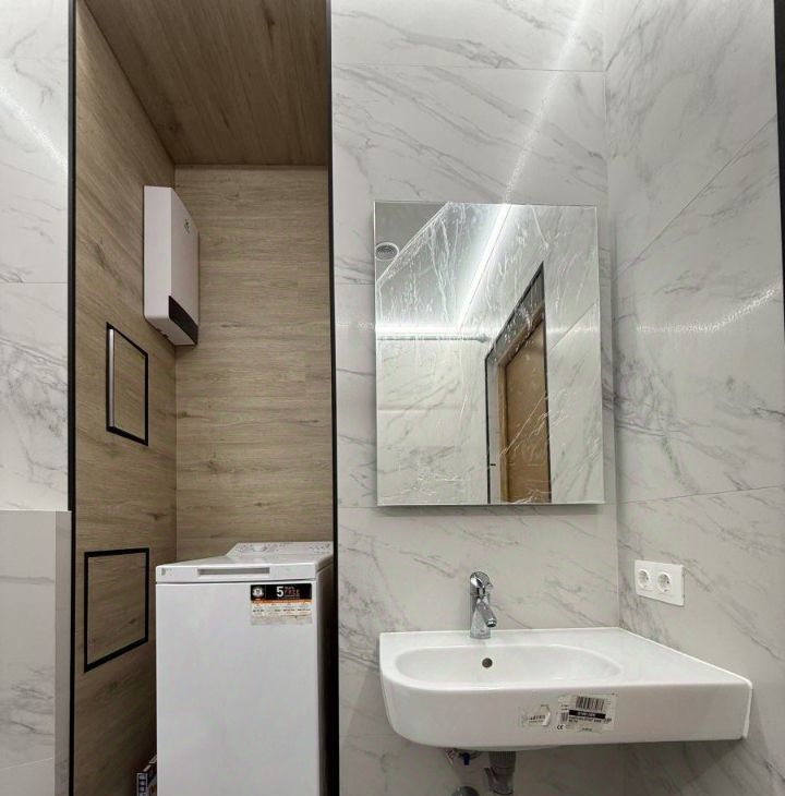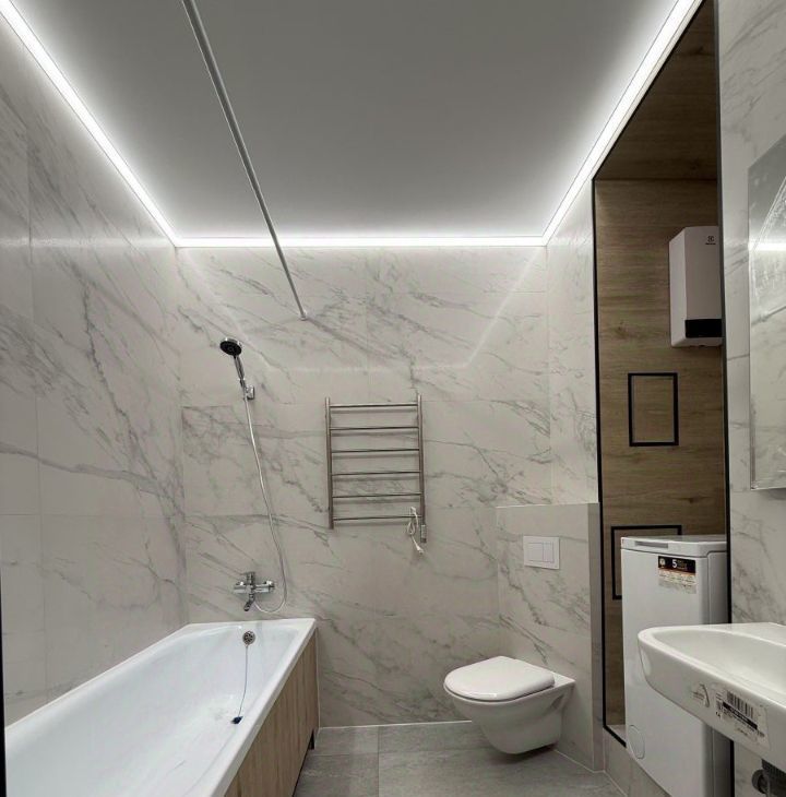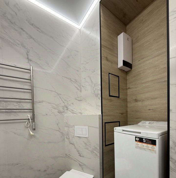 Совмещенный санузел с ванной, зеркало, полотенцесушитель, стиральная машина.