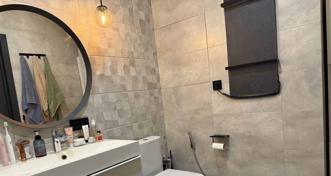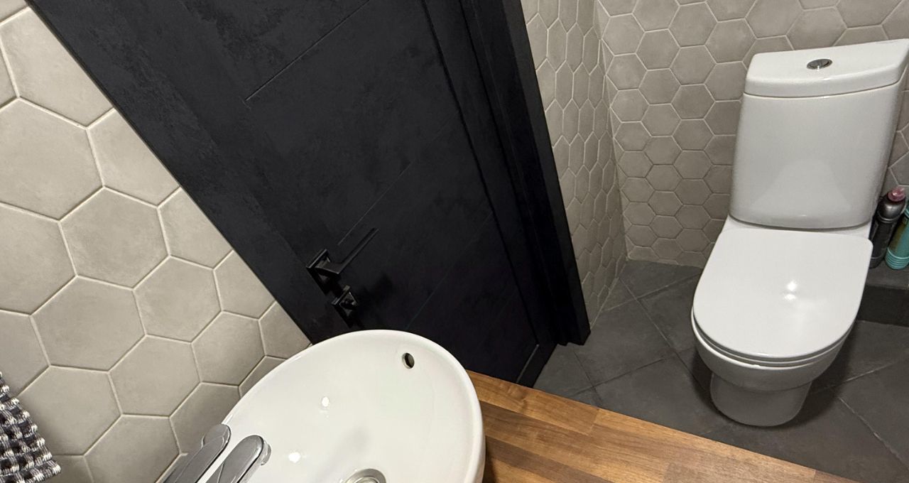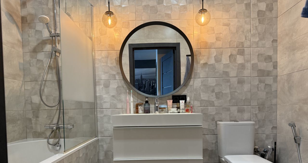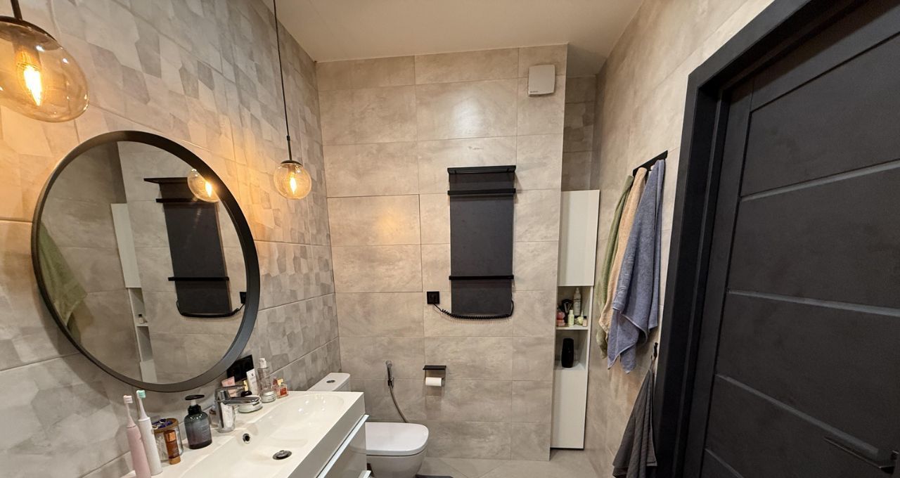 Два санузла оборудованы премиальной сантехникой Villeroy & Boch и Jacob Delafon. В каждом помещении предусмотрены сценарии освещения — от мягкого приглушённого до яркого рабочего света. В ванной комнате установлены лампы с Bluetooth — можно подключить любой гаджет и наслаждаться любимой музыкой.