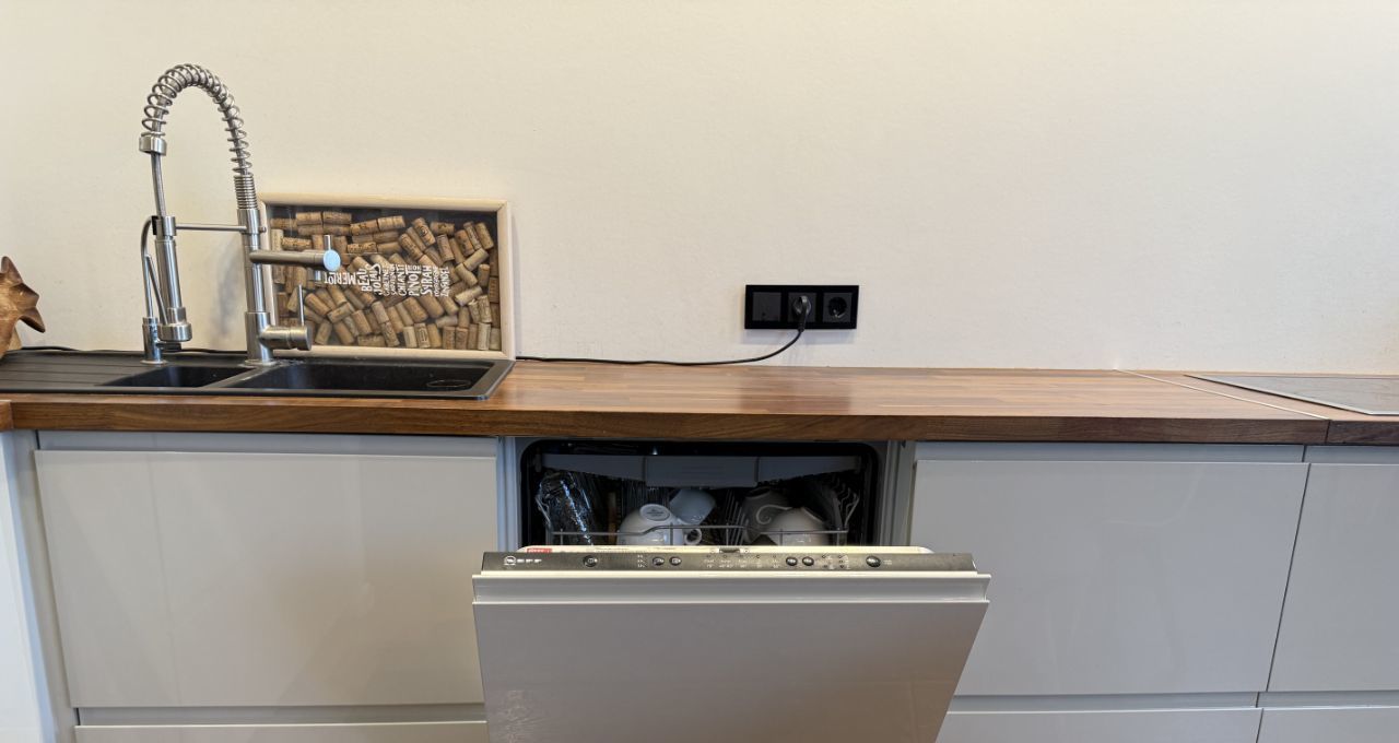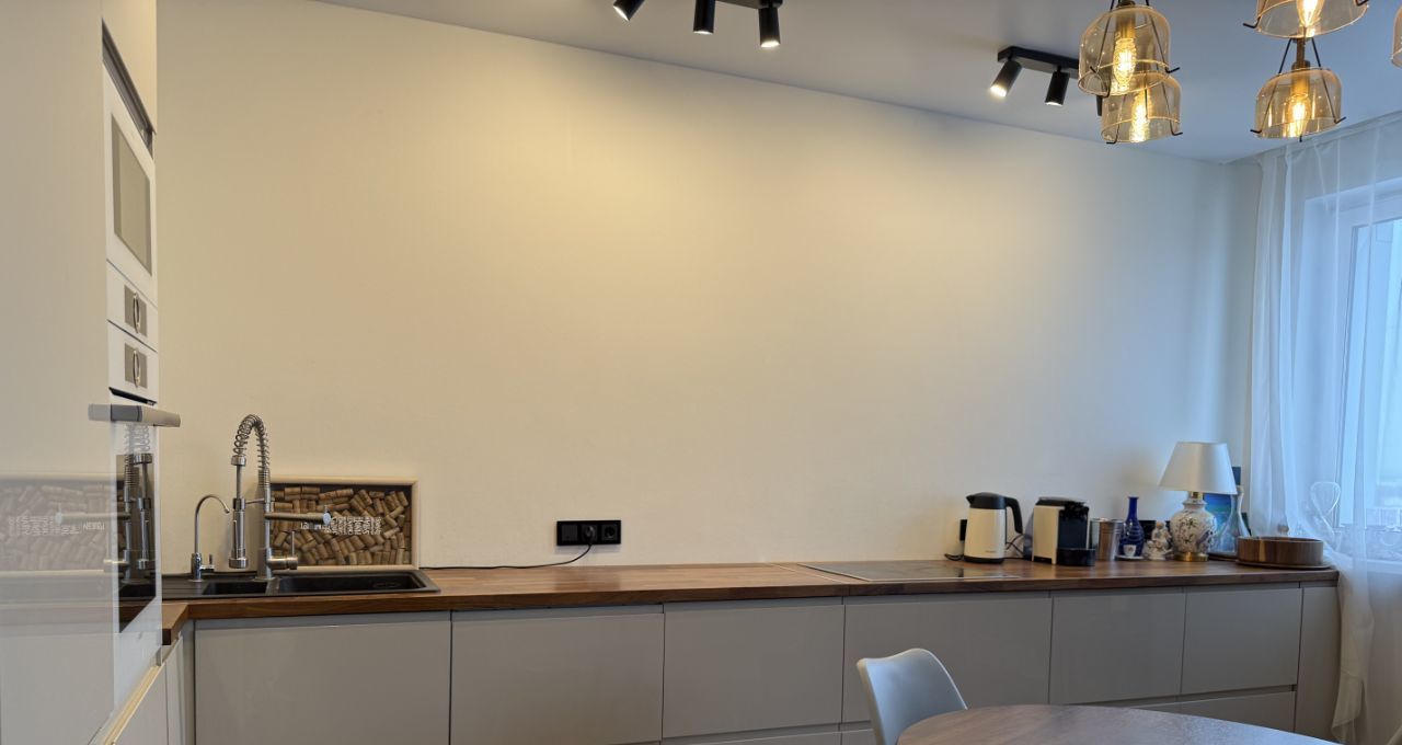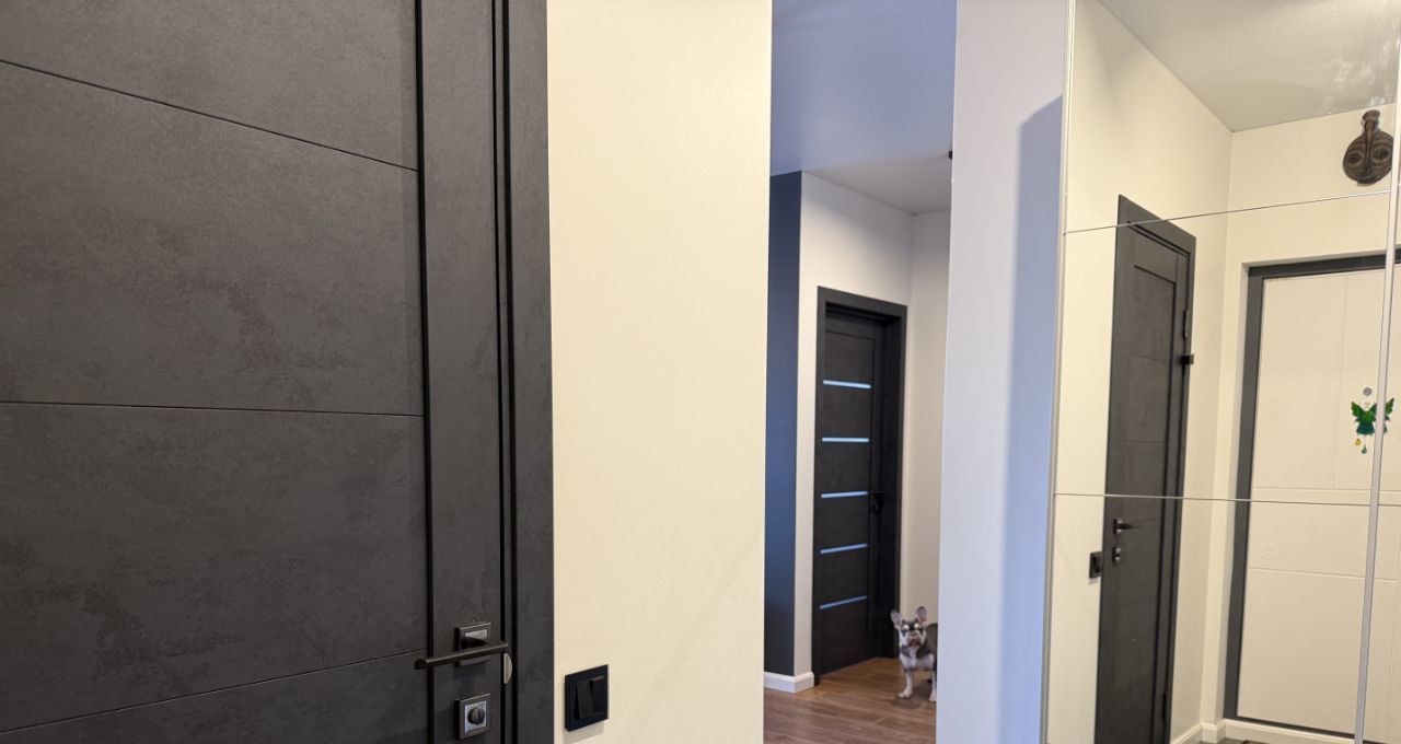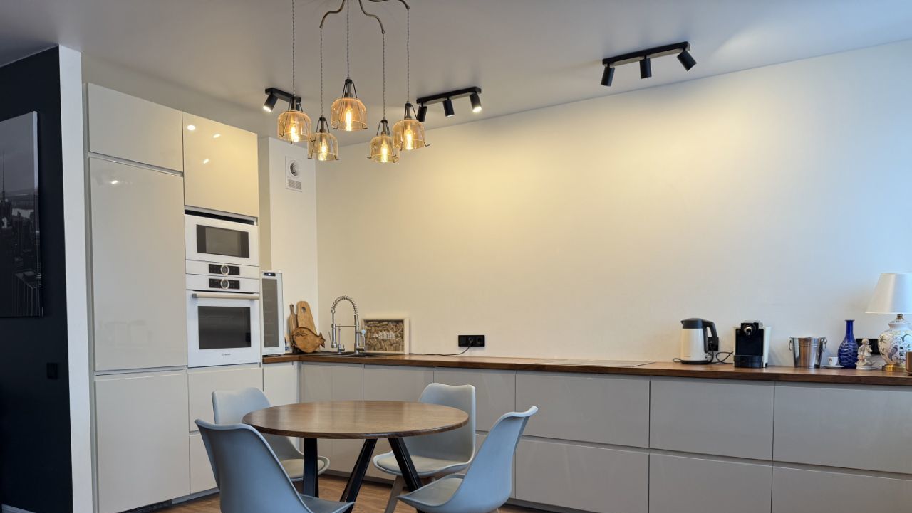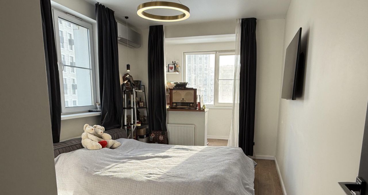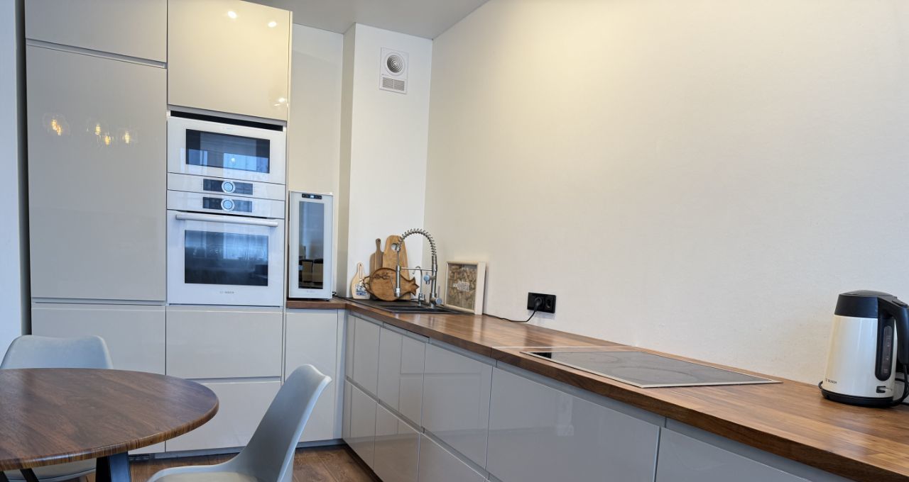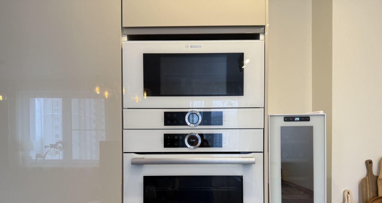 Отдельная гардеробная оснащена встроенными шкафами. В квартире выполнен дизайнерский ремонт с использованием качественных материалов. Встроенная техника премиальных брендов Bosch и Neff — холодильник, посудомоечная машина, микроволновая печь — остаётся новым владельцам.