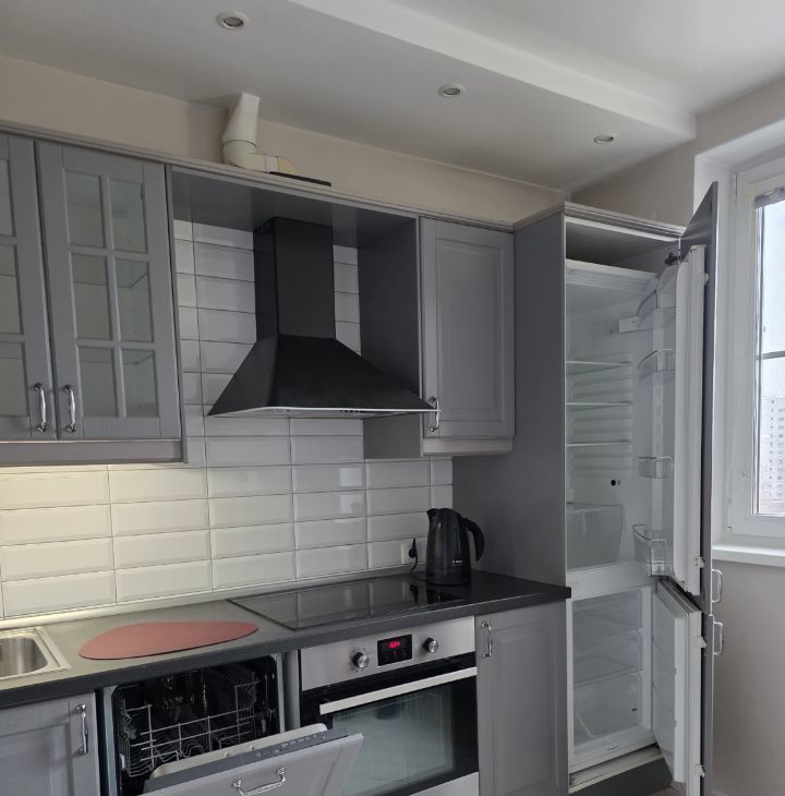 Квартира полностью меблирована, есть вся необходимая техника: холодильник, электрическая индукционная плита, духовой шкаф, посудомоечная машина, стиральная машина, встроенный фильтр для воды, чайник, сушилка для белья, гладильная доска, кондиционеры в каждой комнате, проводка для роутера.