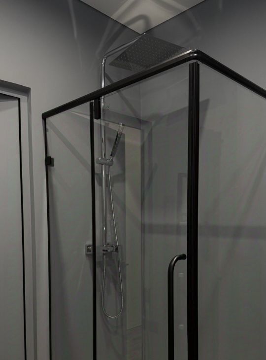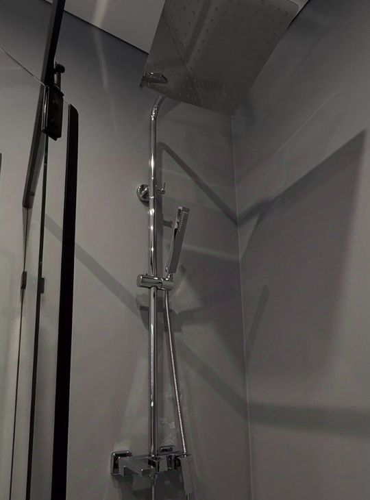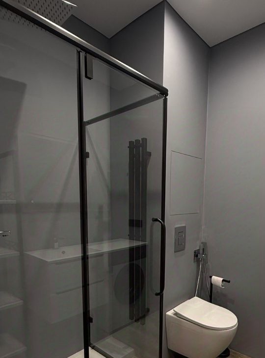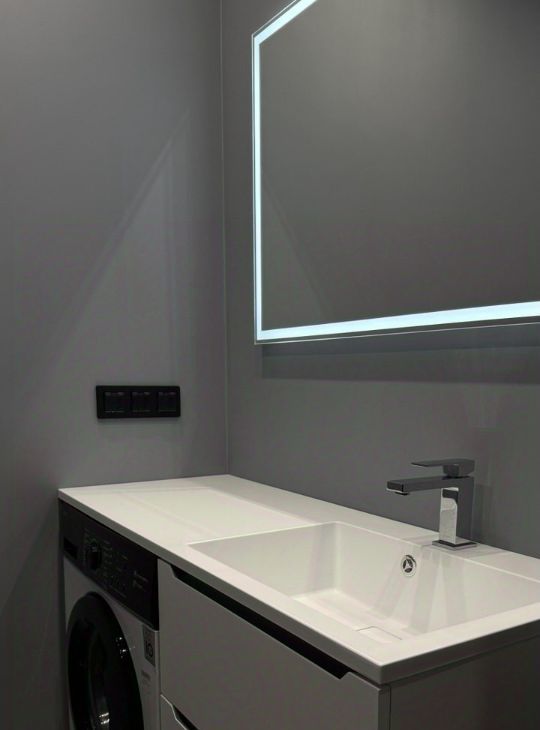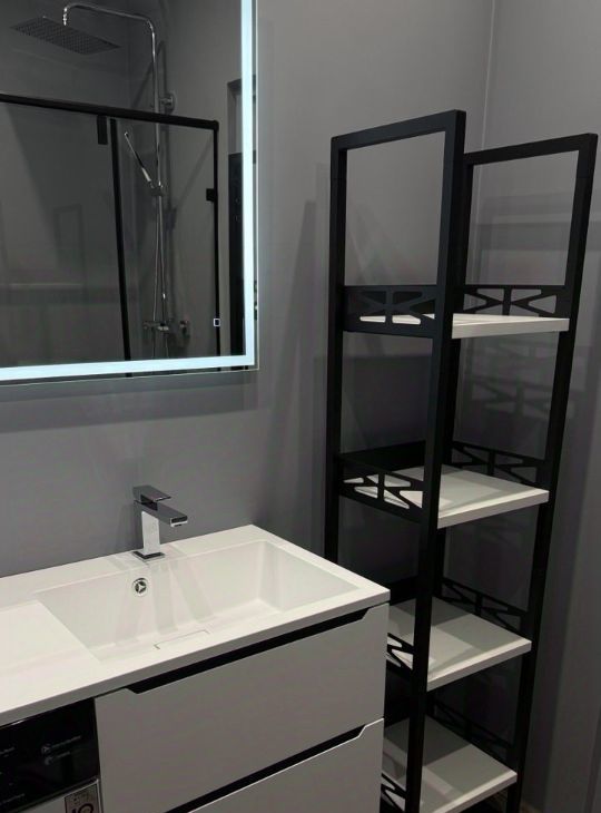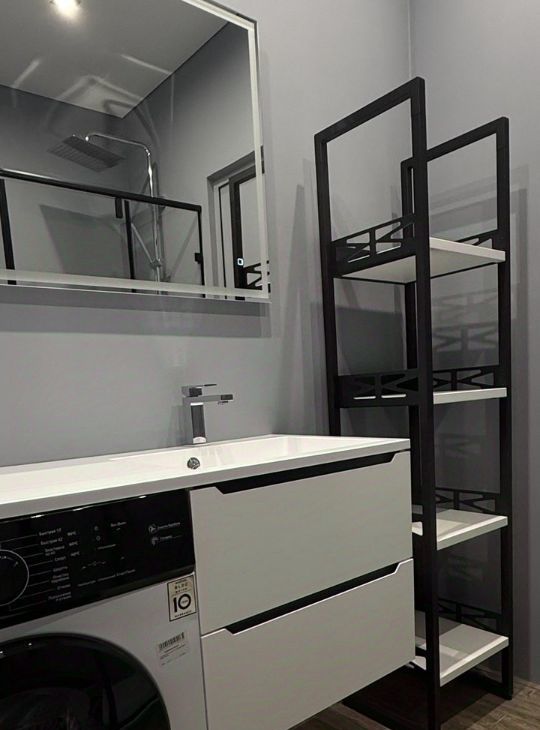 Санузел совмещенный: душевая кабина 80*100, унитаз с гигиеническим душем, стиральная машинка, стеллаж, большое зеркало.