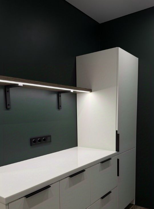 Коридор оснащен встроенным шкафом во всю стену, где один пенал выделен под хранение техники для уборки (вертикальный пылесос, парогенератор)