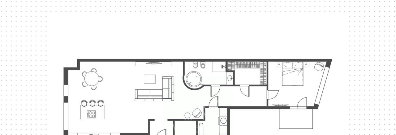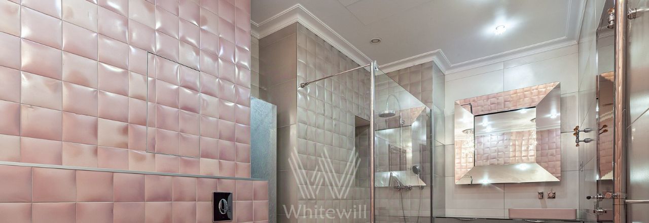 В апартаментах спланирована просторная гостиная-столовая, объединённая с кухней со столом-островом. В уютной спальне с балконом установлена двуспальная кровать. Санузел оснащен джакузи, душевой и бойлером. Дополнительно оборудована постирочная и гардеробная.