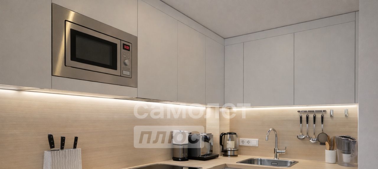 Кухня выполнена в современном минималистичном стиле — светлая, аккуратная и визуально лёгкая. Фасады без лишних деталей, встроенная подсветка рабочей зоны и продуманная геометрия создают ощущение порядка и уюта.