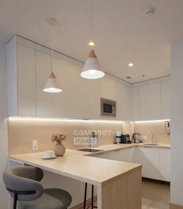 Барная стойка выполняет сразу несколько функций — место для завтраков, работы за ноутбуком или спокойного ужина. Подвесные светильники добавляют мягкий свет и делают пространство особенно уютным в вечернее время.