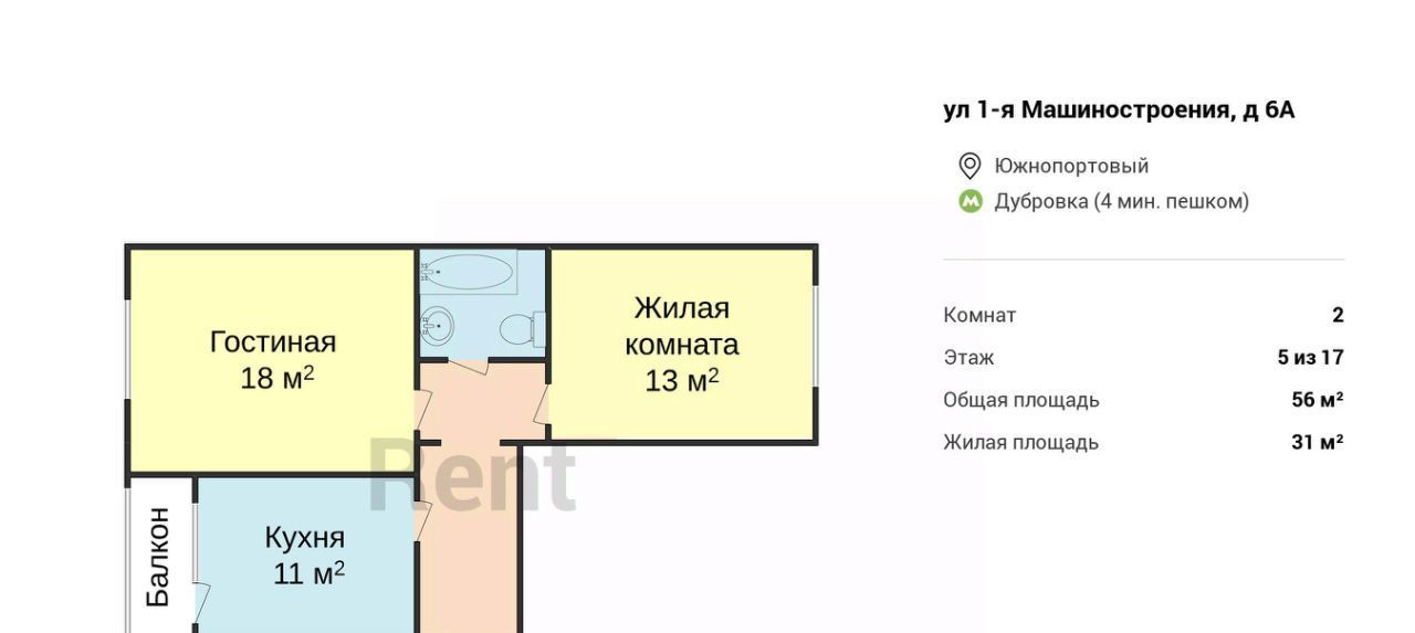 2-к кв. Москва ул. 1-я Машиностроения, 6А (56.0 м²)