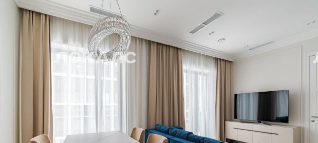Приточно-вытяжная система кондиционирования, встроенный кухонный гарнитур со всей необходимой техникой: холодильник, посудомойка, духовой шкаф и СВЧ печь, индукционная варочная панель. В санузле стиральная и сушильная машина шведского производителя премиум-класса Asko, качественная сантехника из магазина Maxlevel, в гостиной большой телевизор LG Qned 65 дюймов. Вся мебель сделана на заказ у ведущих производителей, массивные двери высотой 2.5м, на полу инженерная доска Finex (раскладка французская елка).