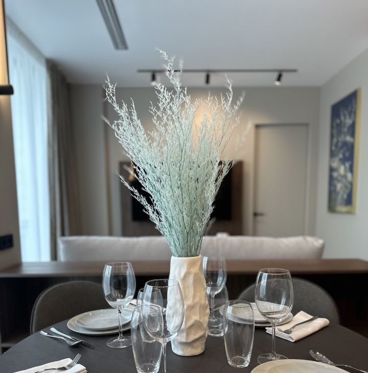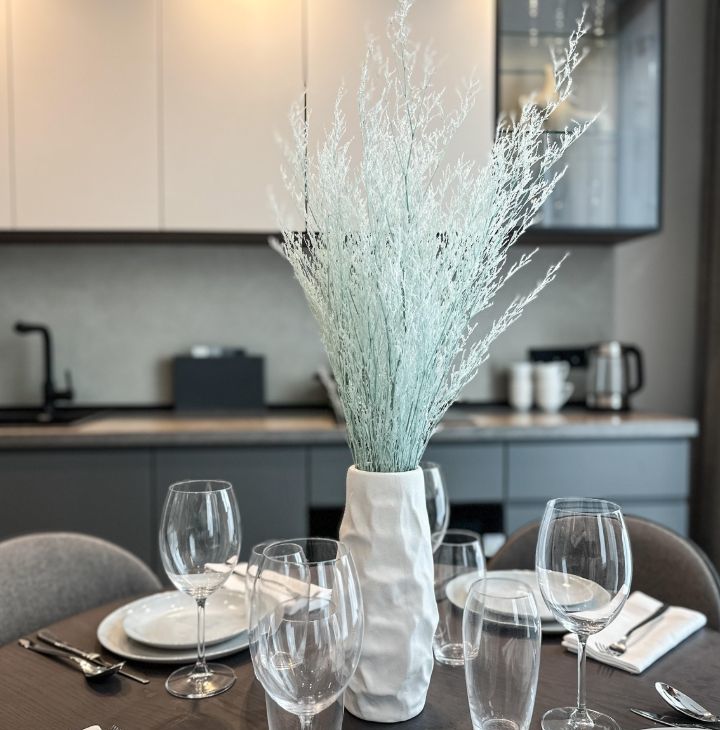 - Кухонная зона: кухонный гарнитур, холодильник, духовой шкаф, электрическая плита, посудомоечная машинка, стол четырьмя стульями и сервировка на четыре персон.
