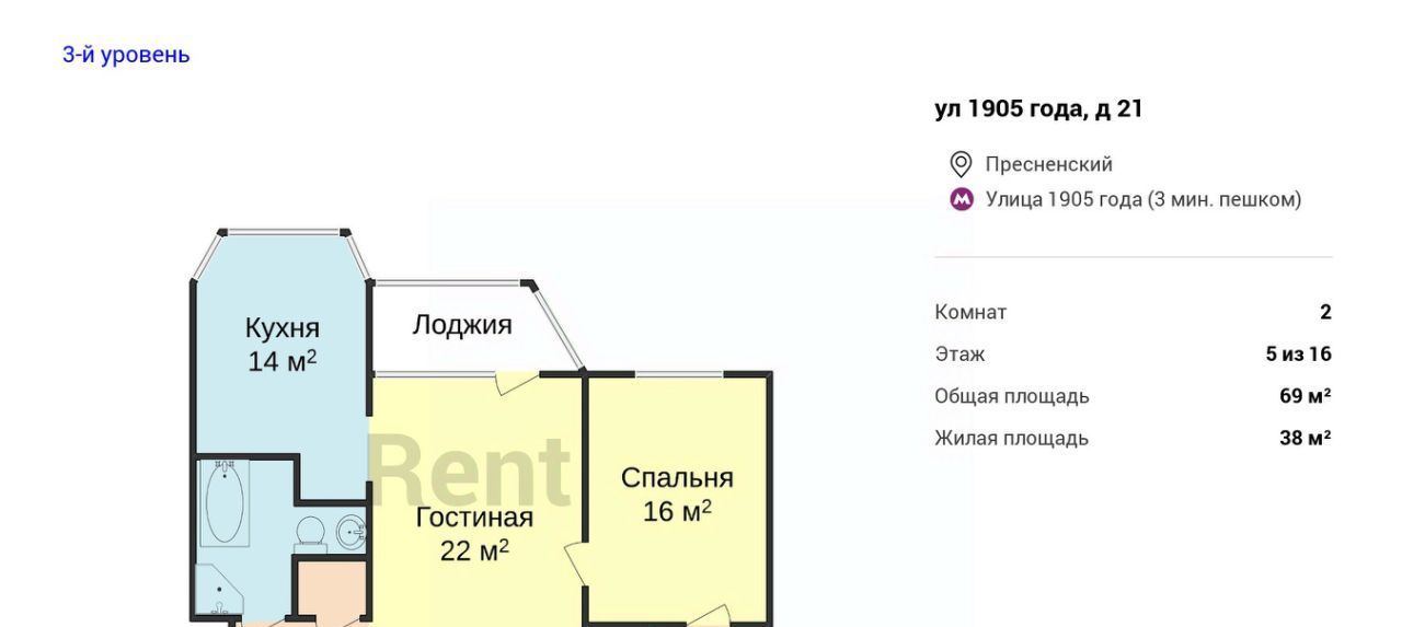 2-к кв. Москва ул. 1905 года, 21 (69.0 м²)