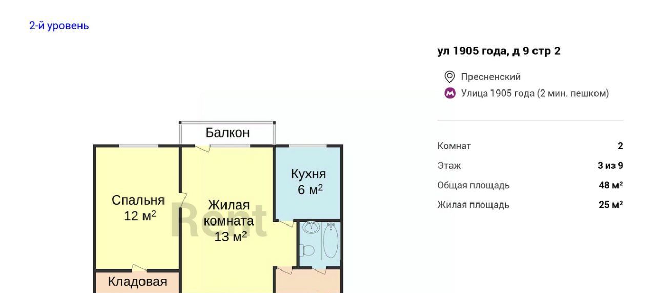 2-к кв. Москва ул. 1905 года, 9С2 (48.0 м²)