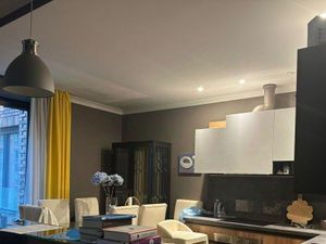 Стильный кухонный гарнитур в едином с гостиной цветовом решении,техника ведущих немецких производителей. Квартира прекрасно меблирована.