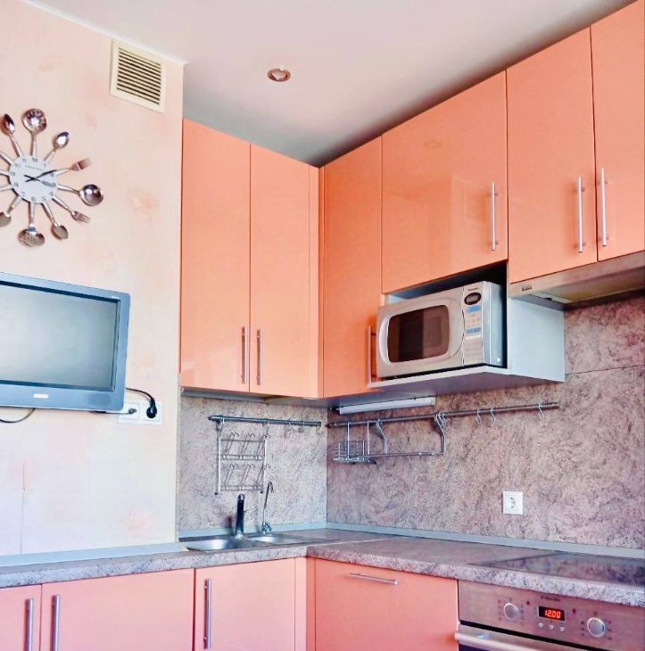 Квартира оборудована всей необходимой для проживания мебелью и техникой: диван-кровать, кухонный гарнитур, плита, стиральная машины, холодильник, микроволновка, чайник, рабочие зоны.