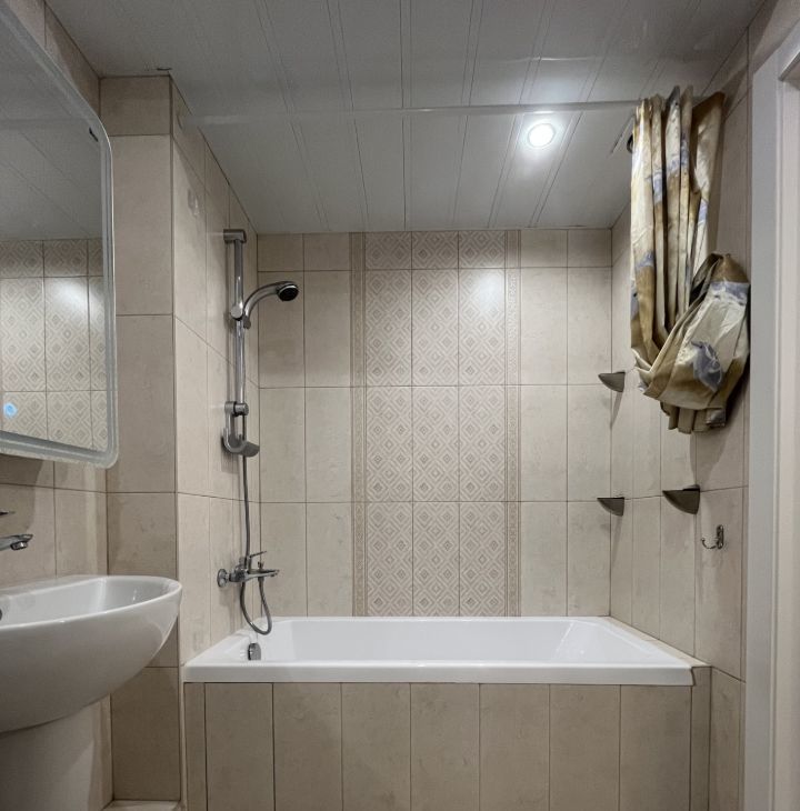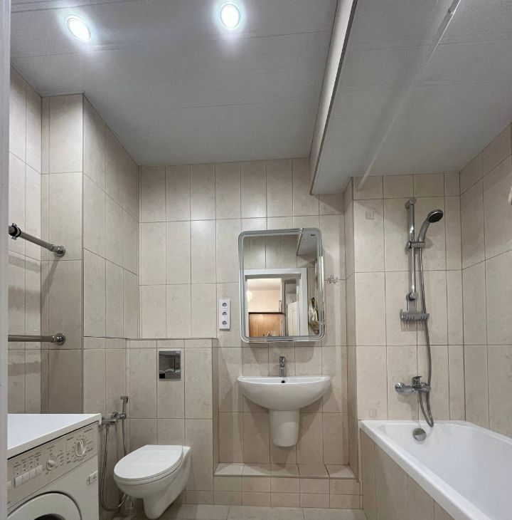 В квартире совмещенный санузел, в котором установлена ванна, стиральная машина Bosch и подвесной унитаз.