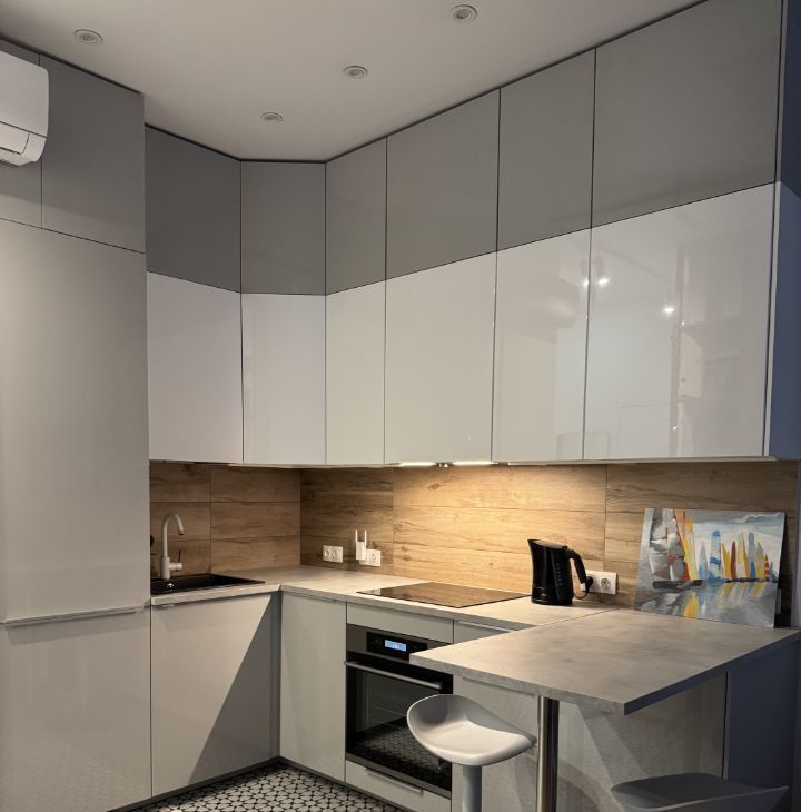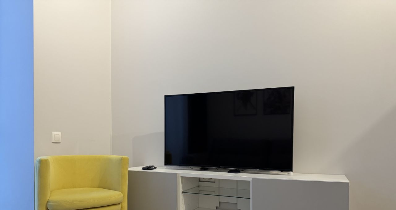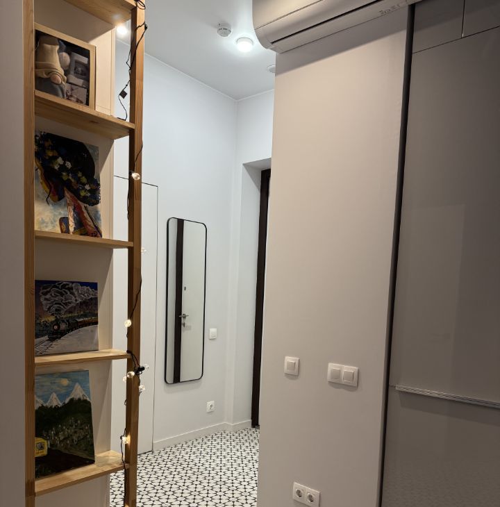 Кухня-столовая и гостиная образуют общее пространство + отдельная спальня со встроенным большим шкафом. Окна выходят во двор, в прихожей шкаф-гардероб и отдельный шкаф для хранения со стиральной машиной . В кухне-гостиной кондиционер, посудомоечная машина, ТВ.