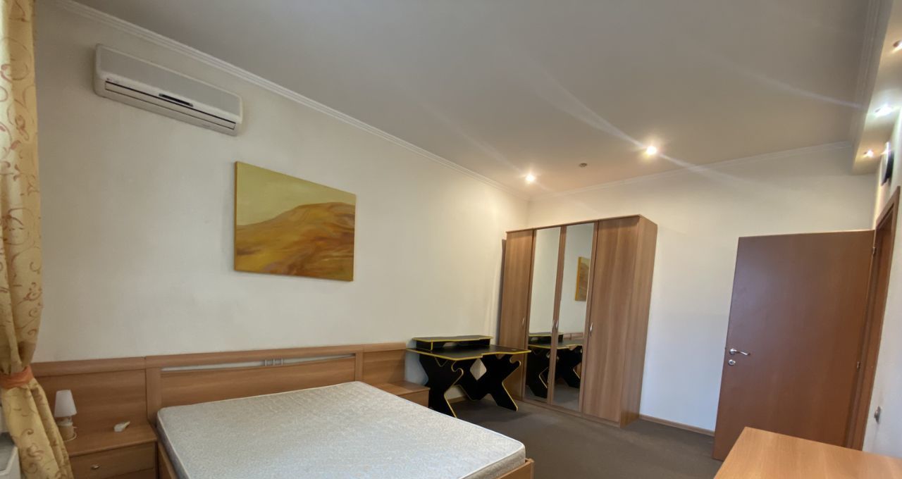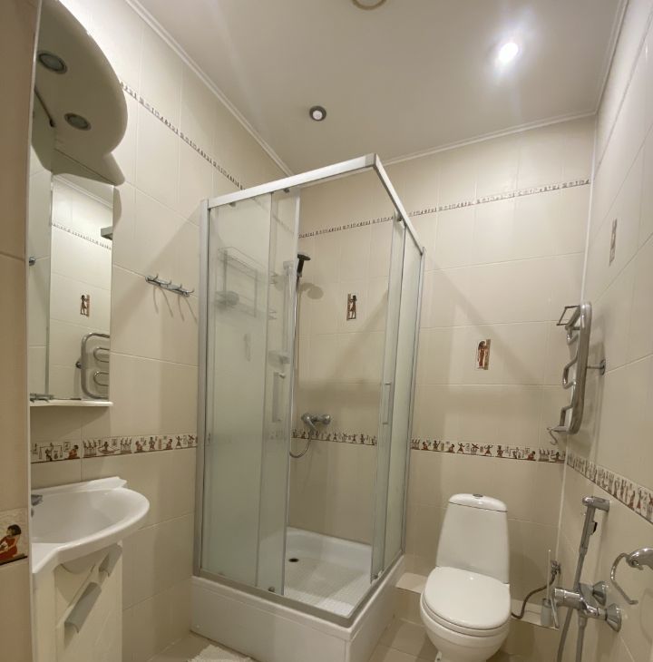 В квартире есть все необходимое для комфортной жизни: кондиционеры в каждой комнате, холодильник, посудомоечная и стиральная машины, телевизор. В комнатах и на кухне установлена удобная мебель. Санузел раздельный, оборудован душевой кабиной. Из окон открывается вид на улицу.