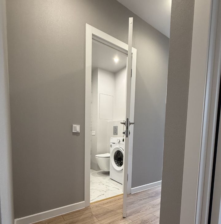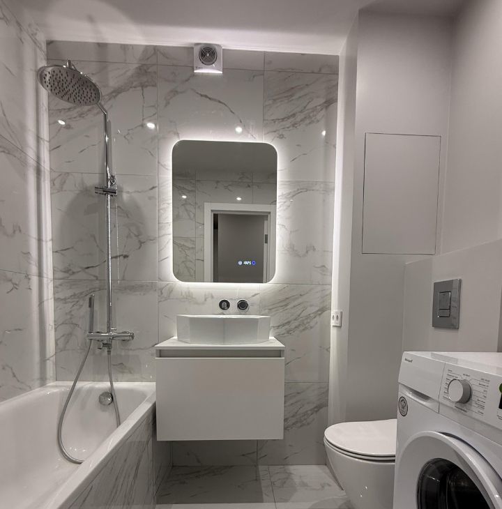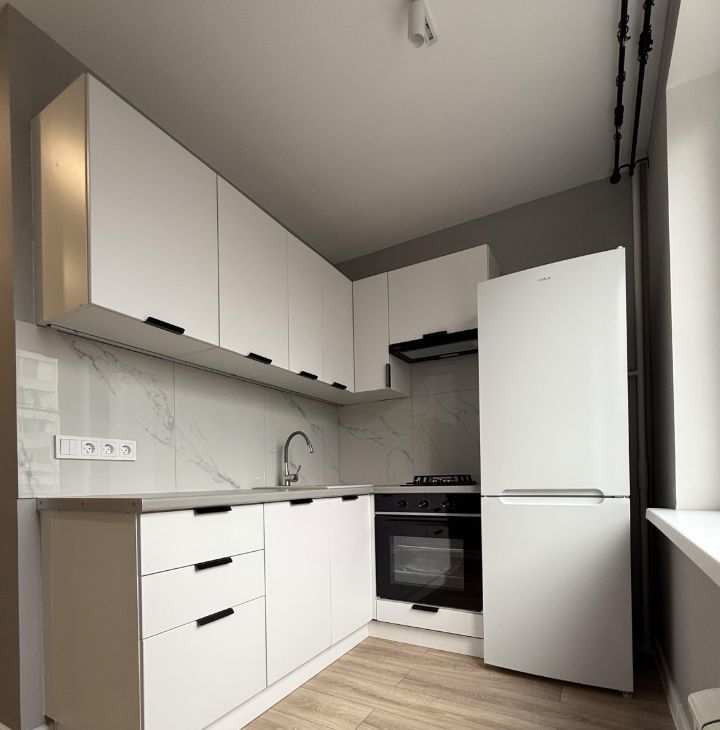 Квартира оснащена всем необходимым для комфортной жизни. Есть кухня со встроенной техникой Weissgauf (посудомоечная машина, газовая плита, духовка, вытяжка, холодильник).