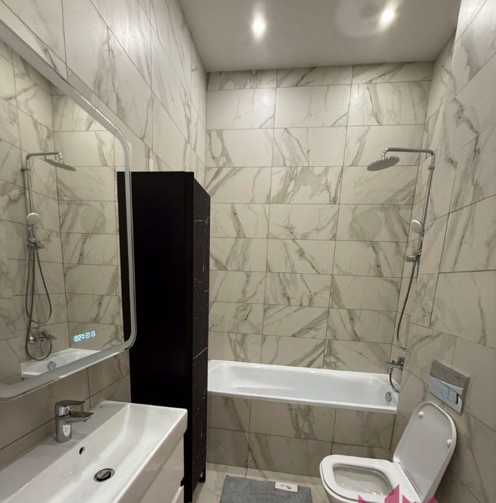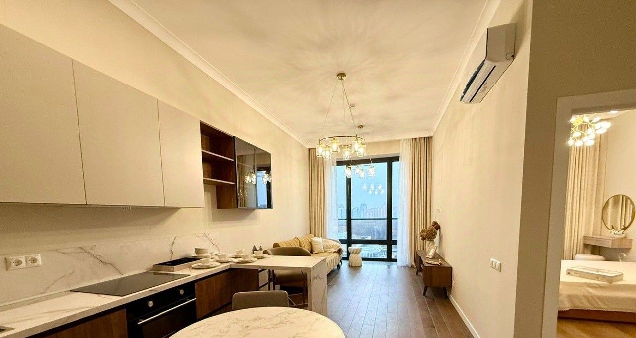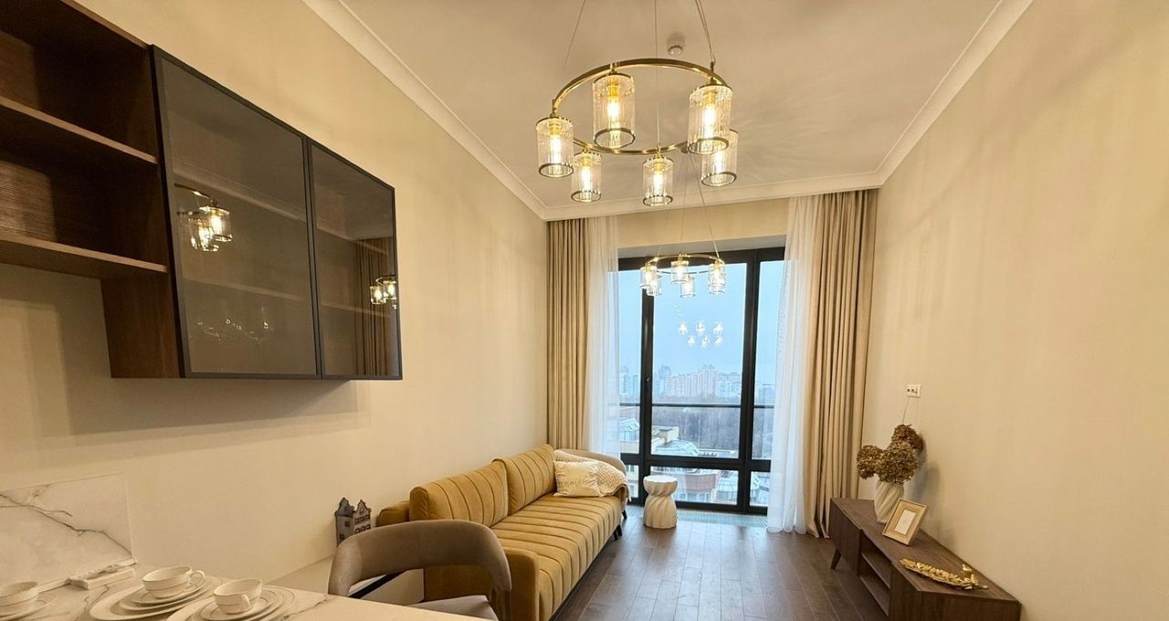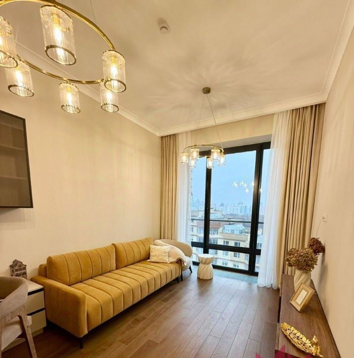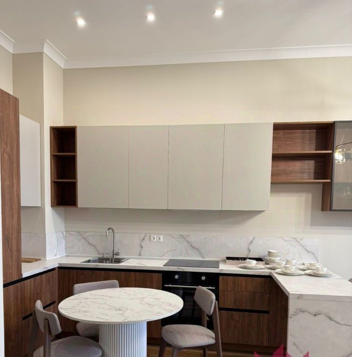 В ремонте использовались премиальные материалы, в гостиной установлен широкий кресло и уютный диван. В кухонной зоне установлен современный кухонный гарнитур со встроенной посудомоечной машиной, духовым шкафом. Ванная комната просторная, так же в ней установлена стиральная машина.