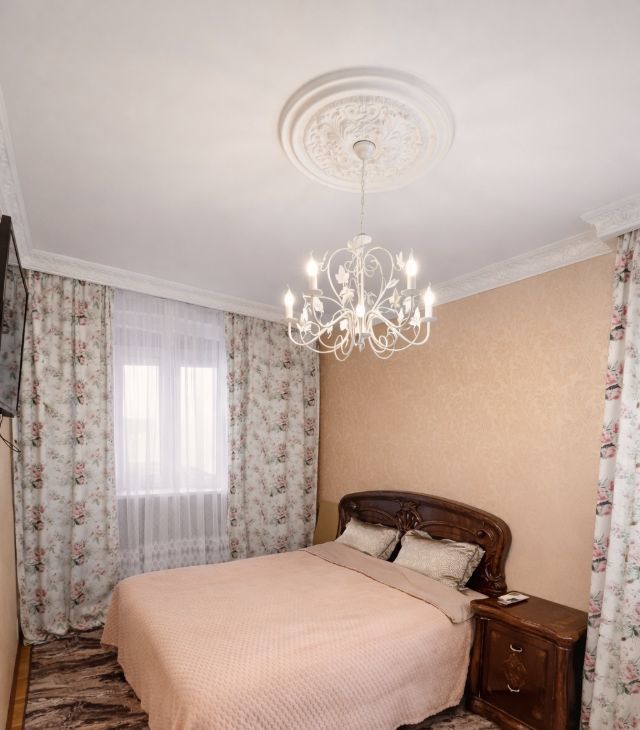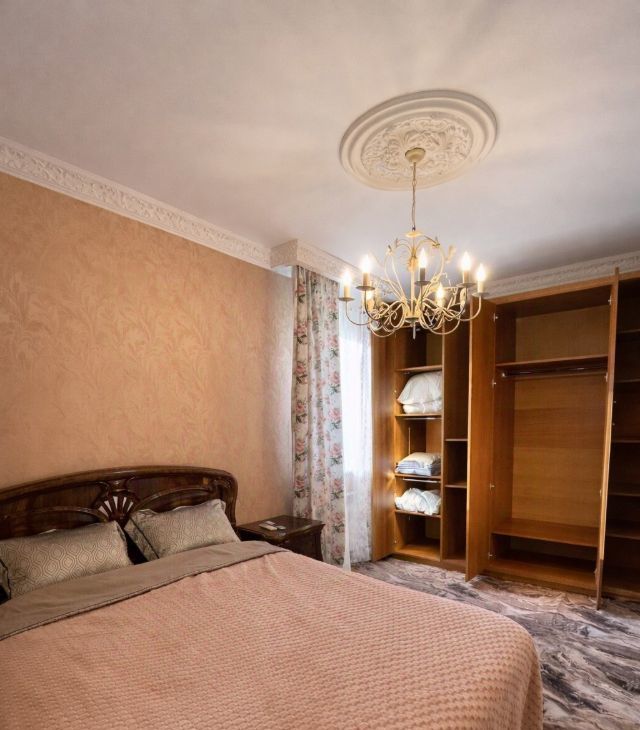 В спальне — широкая двуспальная кровать, вместительный платяной шкаф и телевизор; имеется выход на лоджию.