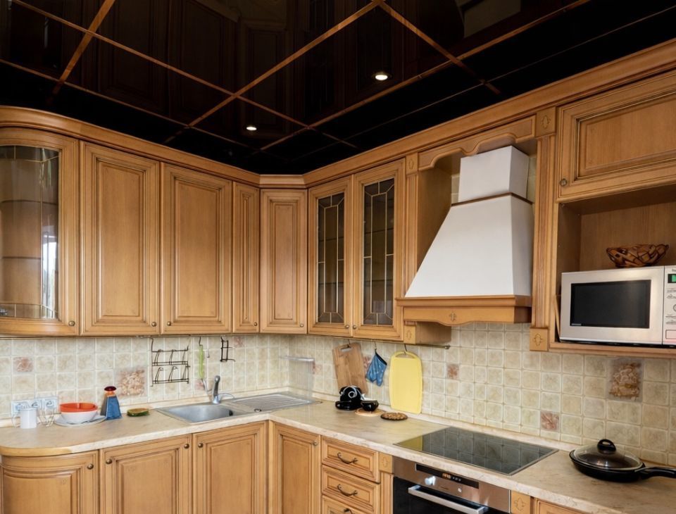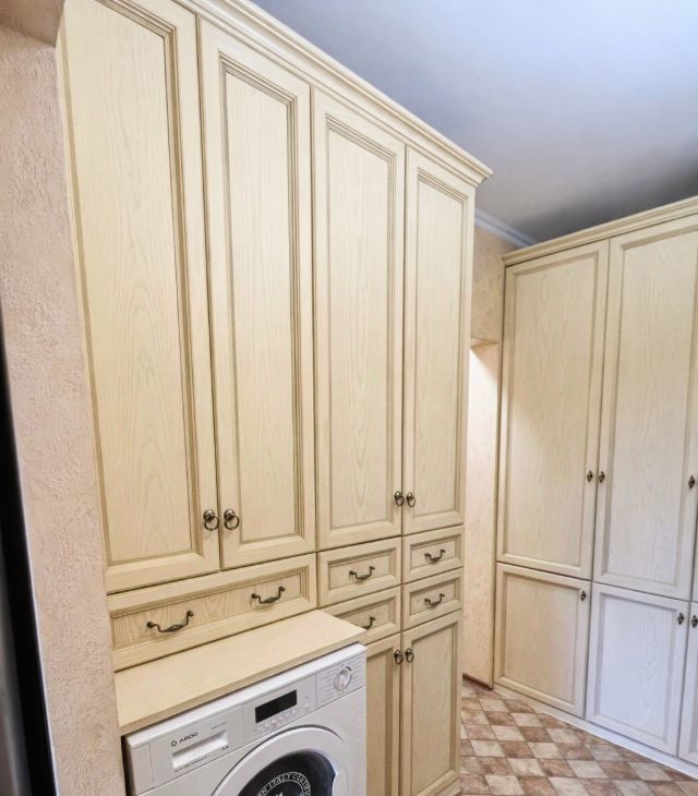 Просторная кухня организована как полноценная обеденная зона и оснащена всей необходимой бытовой техникой для приготовления пищи: духовой шкаф, посудомоечная машина, микроволновая печь, вытяжка, холодильник и электрический чайник. В наличии комплект посуды.