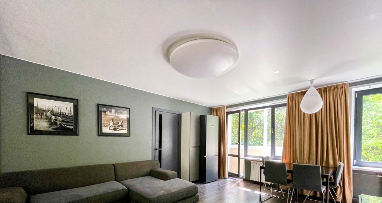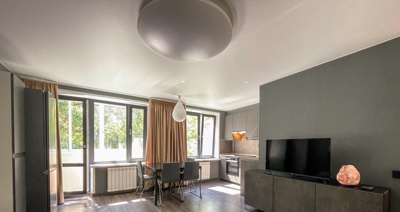 В квартире есть вся необходимая мебель — как на кухне, так и в комнатах. Установлена современная бытовая техника: холодильник, духовой шкаф, и стиральная машины, телевизор.