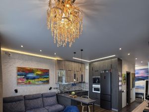 2 утеплённые лоджии (на кухне и в спальне) Качественный кухонный гарнитур с встроенной техникой (холодильник, стиральная машина, духовой шкаф, варочная панель). На полу ламинат и плитка.