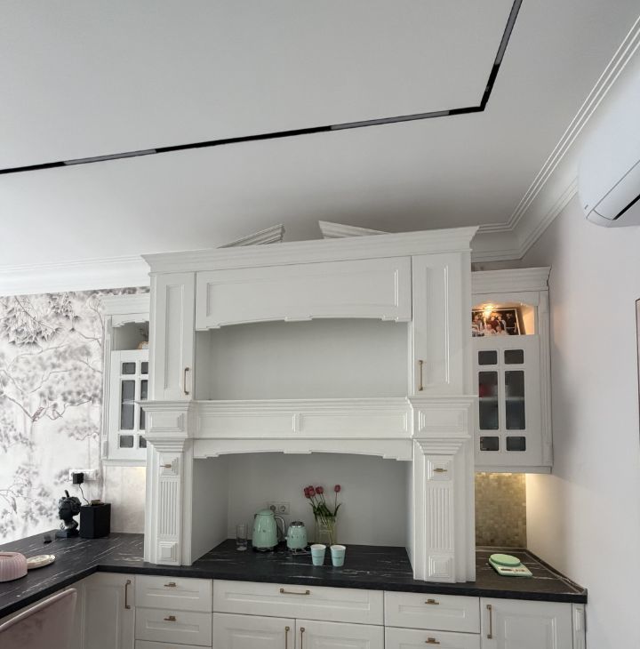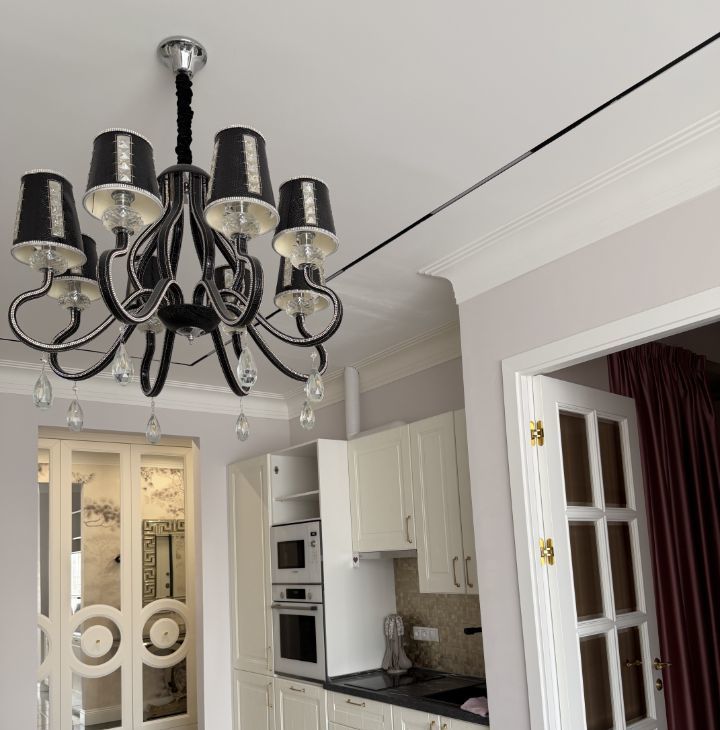 Просторная гостиная, совмещённая с кухней: Идеальное место для приема гостей и уютных вечеров. Центральный элемент — стильный кухонный остров.