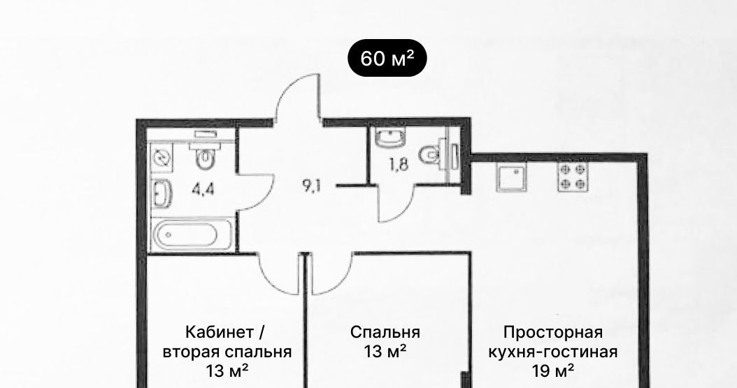 Формат — евродвушка: кухня-гостиная, отдельная спальня и вторая комната (кабинет/гостевая), 2 санузла.