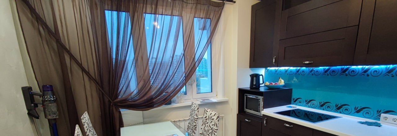 Окна теплой лоджии (с электрическим подогревом пола и двойными стеклопакетами) с потрясающим видом - на Воронцовский парк. Окна кухни и детской комнаты - во двор. Есть посуда для сервировки и приготовления пищи.