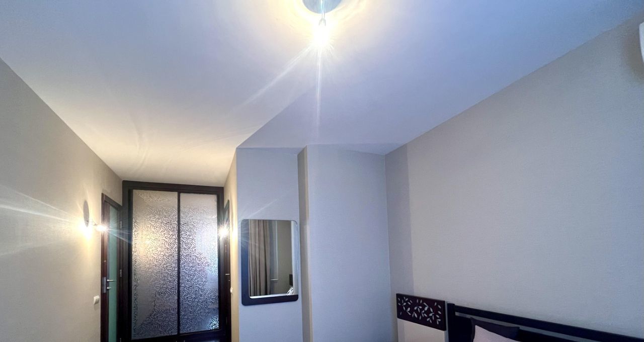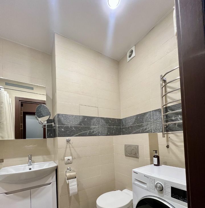 Интерьер квартиры выполнен в современном стиле, имеется вся необходимая мебель и бытовая техника. На кухне: плита, духовой шкаф, посудомойка, СВЧ. Квартира оборудована стиральной машиной, пылесосом. Имеется сушилка , гладильная доска, утюг.