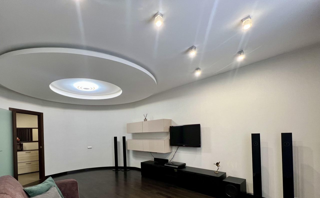 В гостиной: телевизор, акустическая система, Blu-ray плеер, тв-приставка, роутер.