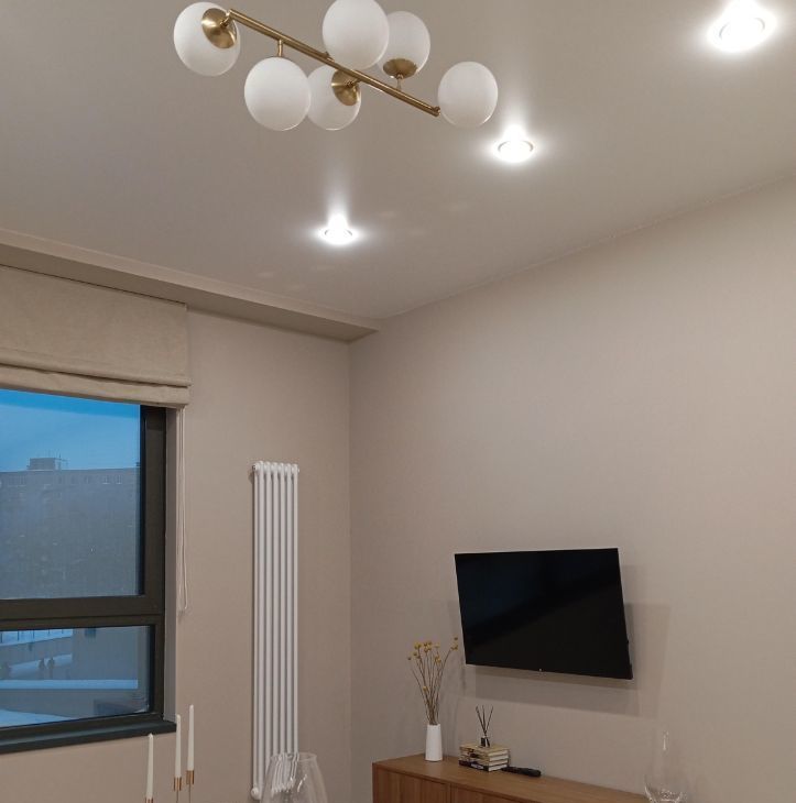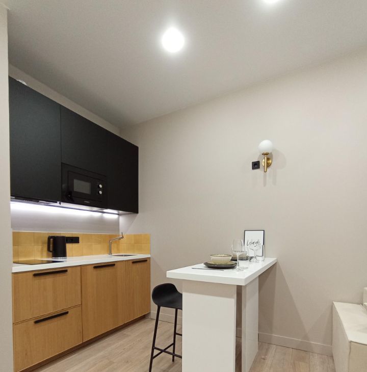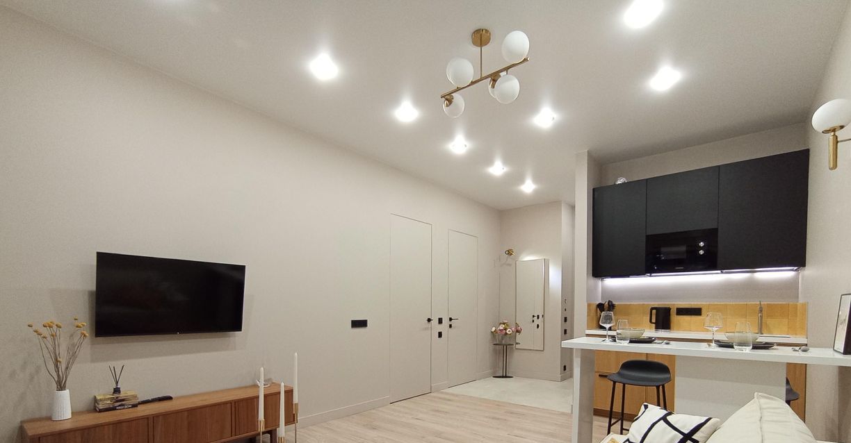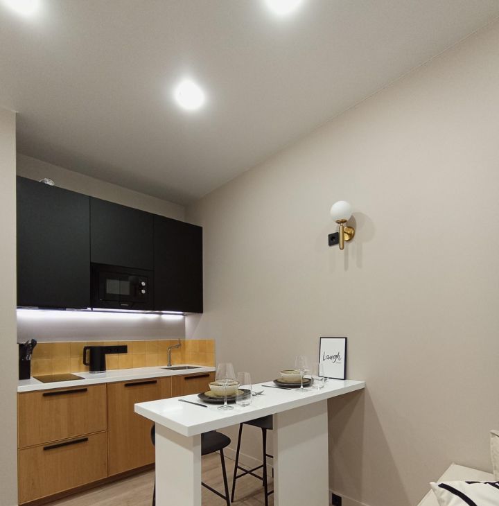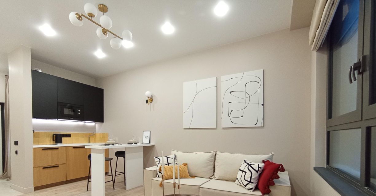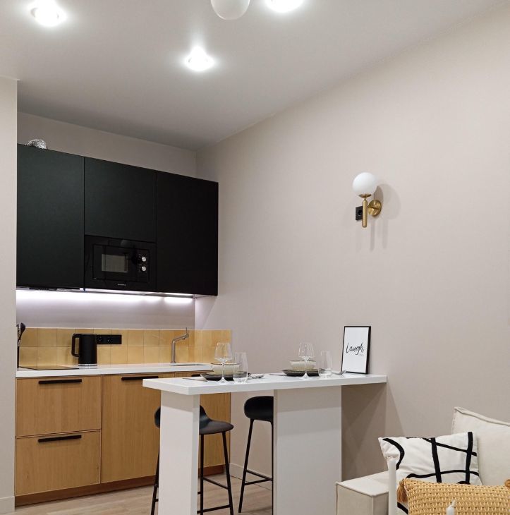 Кухня-гостиная оборудована встроенной бытовой техникой (холодильник, варочная, вытяжка, СВЧ), столешница из искусственного камня, барная стойка, удобный раскладывающийся диван, Smart TV;