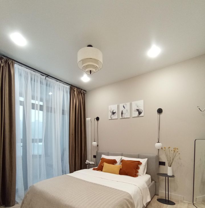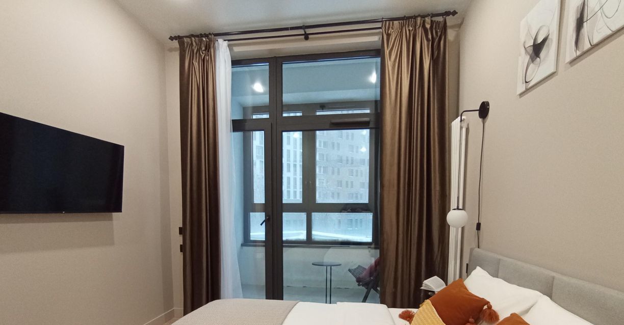 Комфортная спальня — качественная двуспальная кровать с ортопедическим матрасом, вместительные шкафы, Smart TV, выход на лоджию с теплым полом;