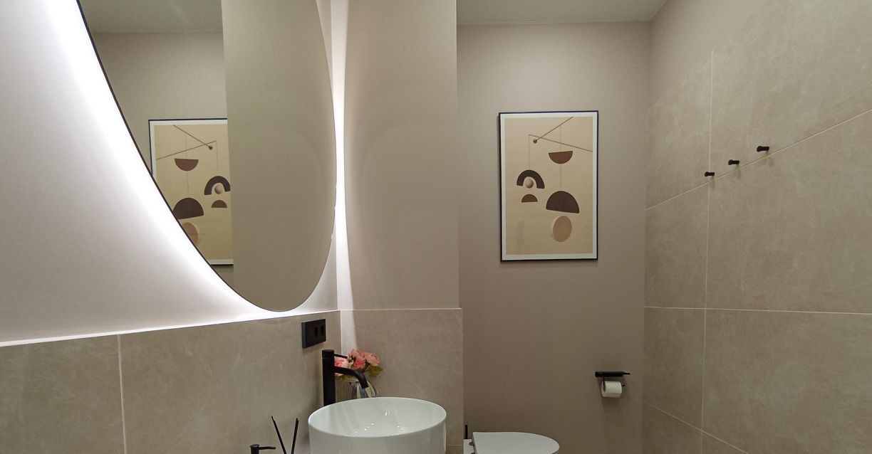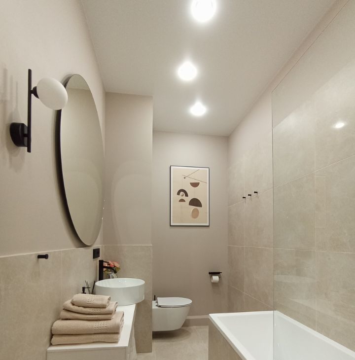 Современный санузел с ванной, теплым полом, огромным зеркалом с подсветкой