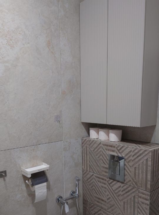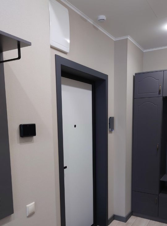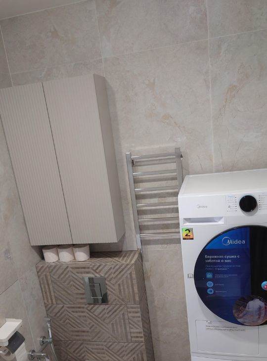 В квартире установлена климатическая система фанкойл, кухня со встроенной техникой и фильтром для воды, в санузле колонна из стиральной и сушильной машин. Сантехника японского бренда tokito, ламинат tarkett 33 класса, инсталляция и унитаз grohe, датчики протечки.