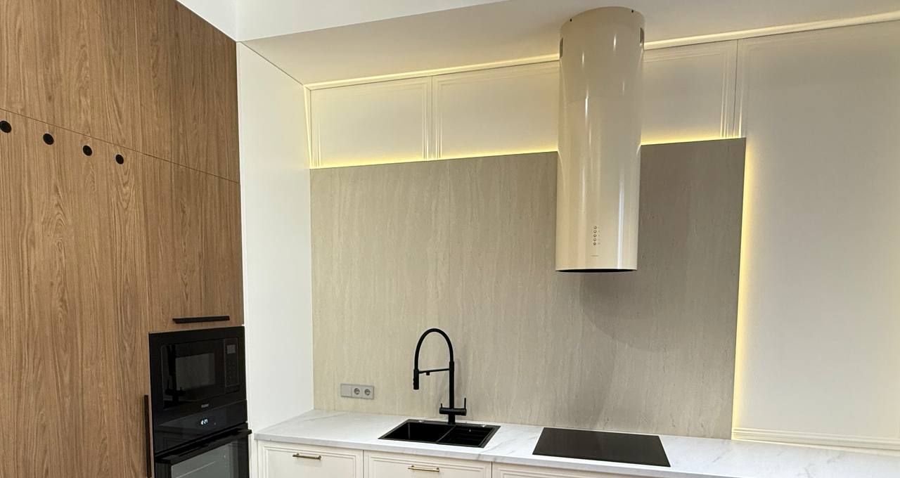 Техника: Установлена вся необходимая встроенная и отдельно стоящая техника: холодильник с системой No Frost, варочная панель, духовой шкаф, вытяжка, стиральная машина, посудомоечная машина, микроволновая печь и телевизор в гостиной. Вся техника новая, на гарантии.
