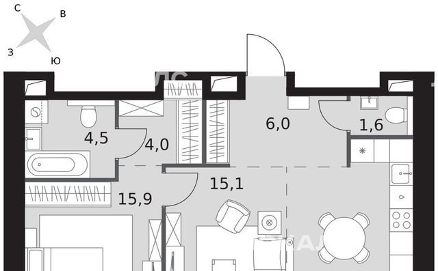 Функциональная планировка: просторная кухня-гостиная, изолированная спальня, 2 с/у.