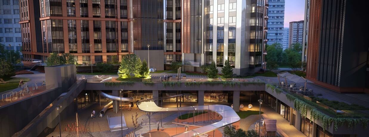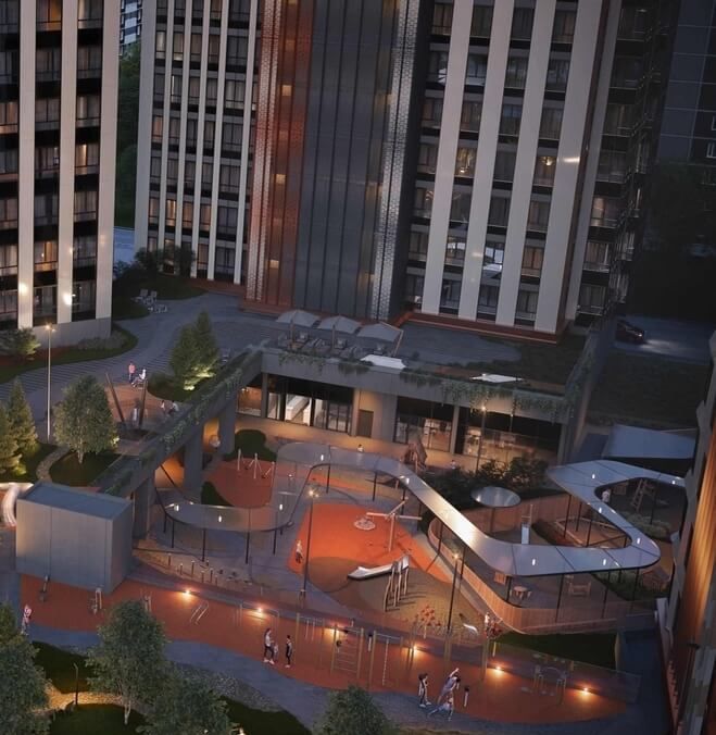 Инфраструктура: в каждом подъезде есть колясочная, скоростные лифты, в гранд-лобби консьерж-сервис, есть две комнаты для переговоров, теплая детская площадка и коворкинг. Двухуровневый двор с спортивной площадкой, частный детский сад и игровые площадки для детей разного возраста, площадка для йоги и подвесные качели. По всему ЖК видеонаблюдение, со временем подключат бесключевой доступ в подъезд.