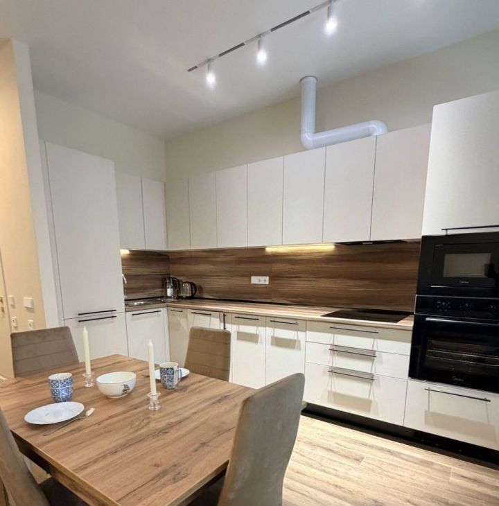 Квартира оборудована всей необходимой бытовой техникой: СВЧ, посудомоечная машина, духовой шкаф, варочная панель, вытяжка, стиральная машина.