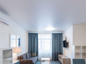 В квартире сделан евроремонт. Площадь жилой зоны составляет 45 квадратных метров, а кухня порадует вас своими 10 квадратными метрами. Обстановка включает всё необходимое для комфортного проживания: кондиционер, холодильник, телевизор и стиральная машина. Санузел раздельный, окна выходят во двор, что гарантирует тишину и спокойствие.