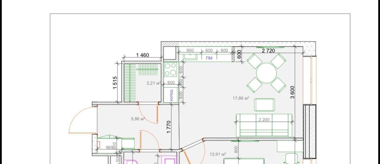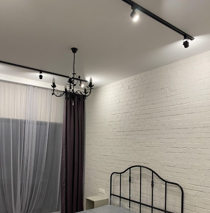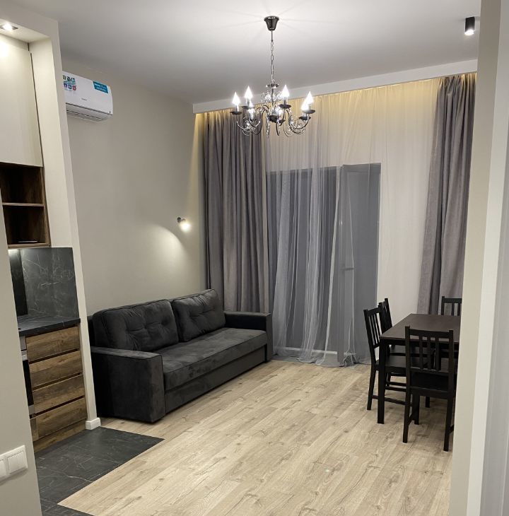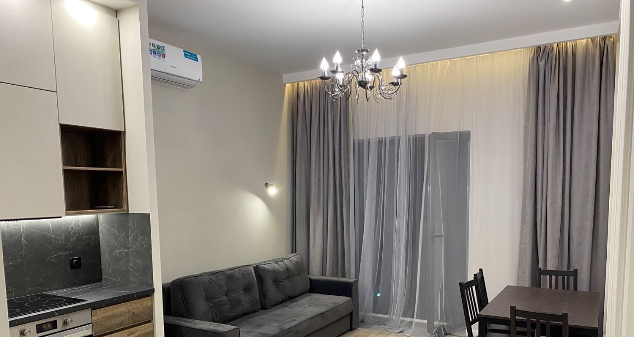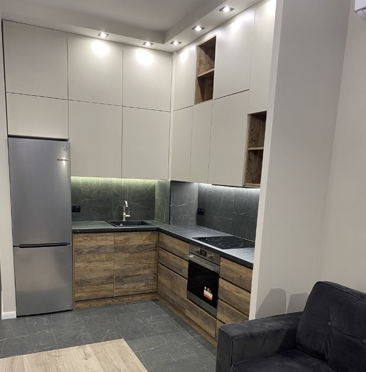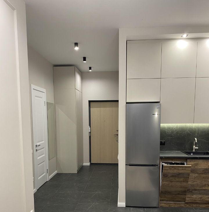 Просторная кухня-гостиная + изолированная спальня + гардеробная. Потолки 3 м.
