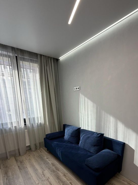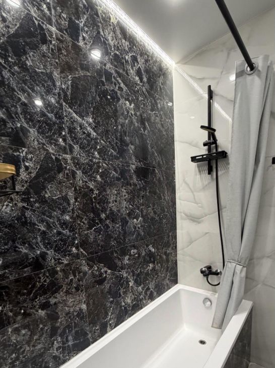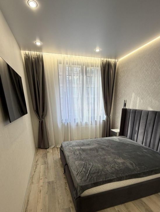Спальня оборудована кроватью, сделанной под заказ, с подъемным механизмом, шкафом, а так же дизайнерскими шторами. Просторная ванная комната со стиральной машиной и большой ванной с подсветкой. Возможна аренда вместе с парковочными местами.