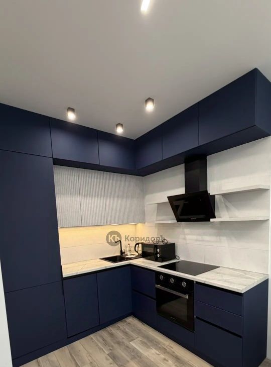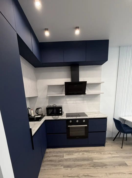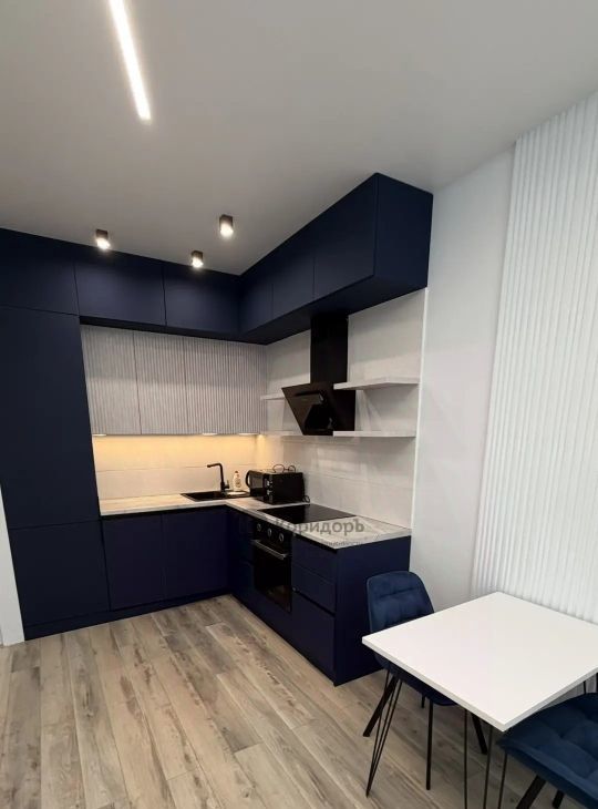 уютная кухня-гостиная, оборудованная всей необходимой встроенной техникой и кухонной мебелью с подсветкой;