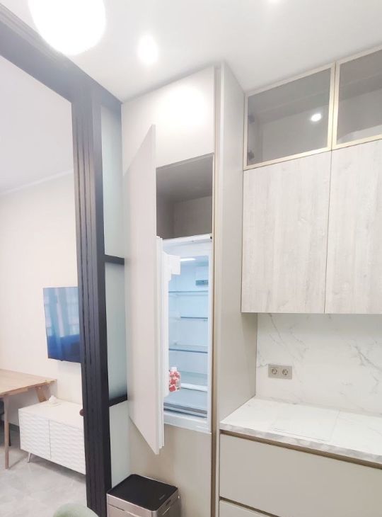 Кухня со всей встроенной техникой. Просторные места для хранения, включая кровать с подъемным механизмом. Большой телевизор, интернет.